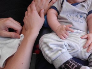 Ryanair. Słabo to widać, ale mały leży na moich kolanach z głową i pleckami na podróżnym rogalu. Obok siedzi Marcin, pod nogi mamy wciśniętą część bagażu podręcznego (moja walizka poszła do luku), a po bokach płaszcze.