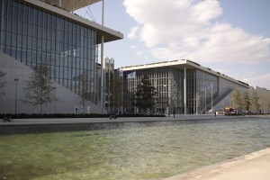 Budynki są „wtopione” we wzgórze, schody z prawej strony wiodą wprost do parku, którego przedłużenie znajduje się na dachu biblioteki.