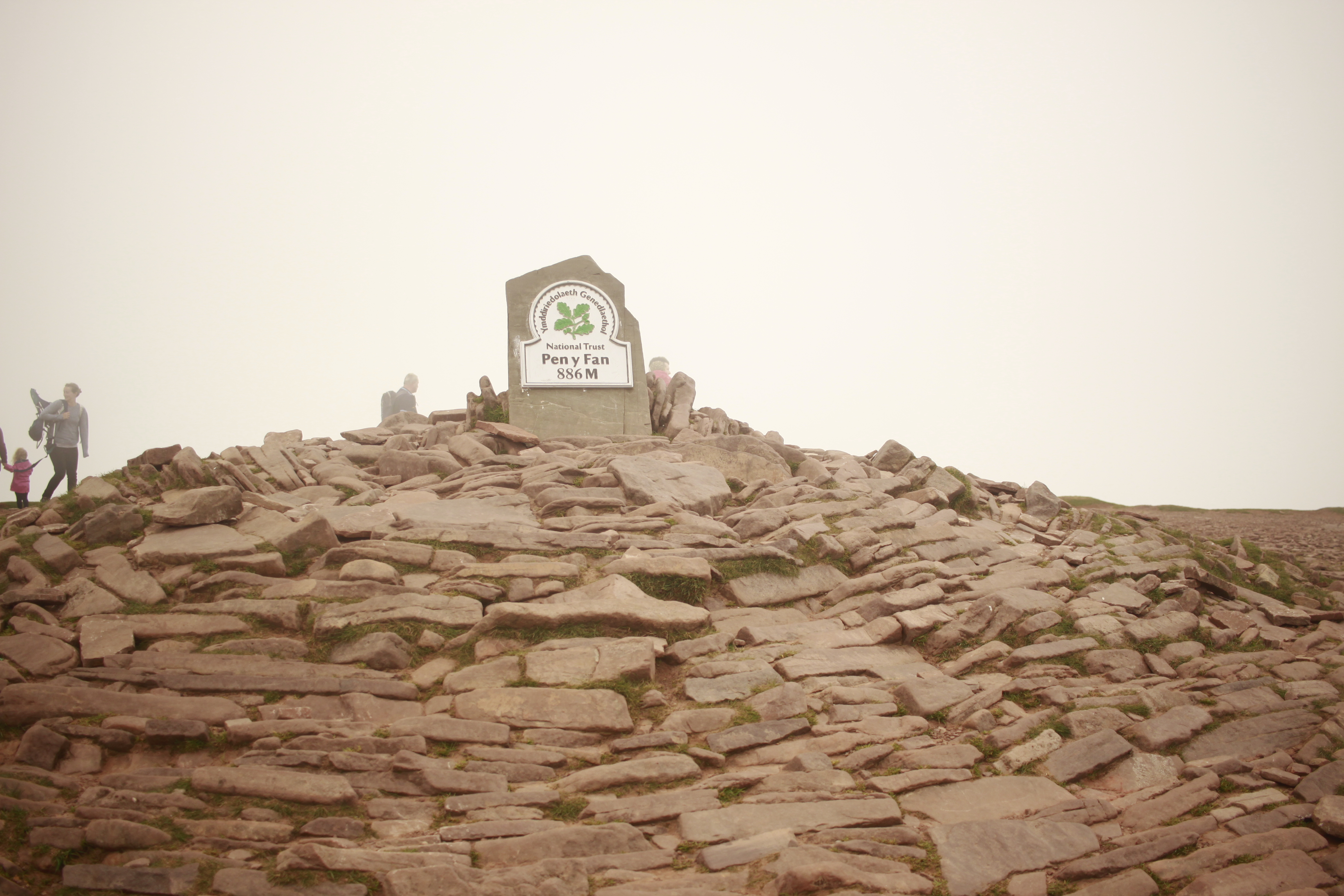 Pen y Fan. Tak kupka kamieni służyła w epoce brązu jako kurhan. Jak widać, szczyt był akurat w chmurze i oczywiście wiatr urywał głowę, ale korzystając z drzemki małego zrobiliśmy postój na jedzenie.