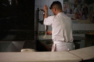 Do tej maszynki wrzuca się ciasto i wyciska wąskie wałeczki churros. Porros wyciska się z czegoś w rodzaju pistoletu, który akurat ten pan podtrzymywał sobie ramieniem.