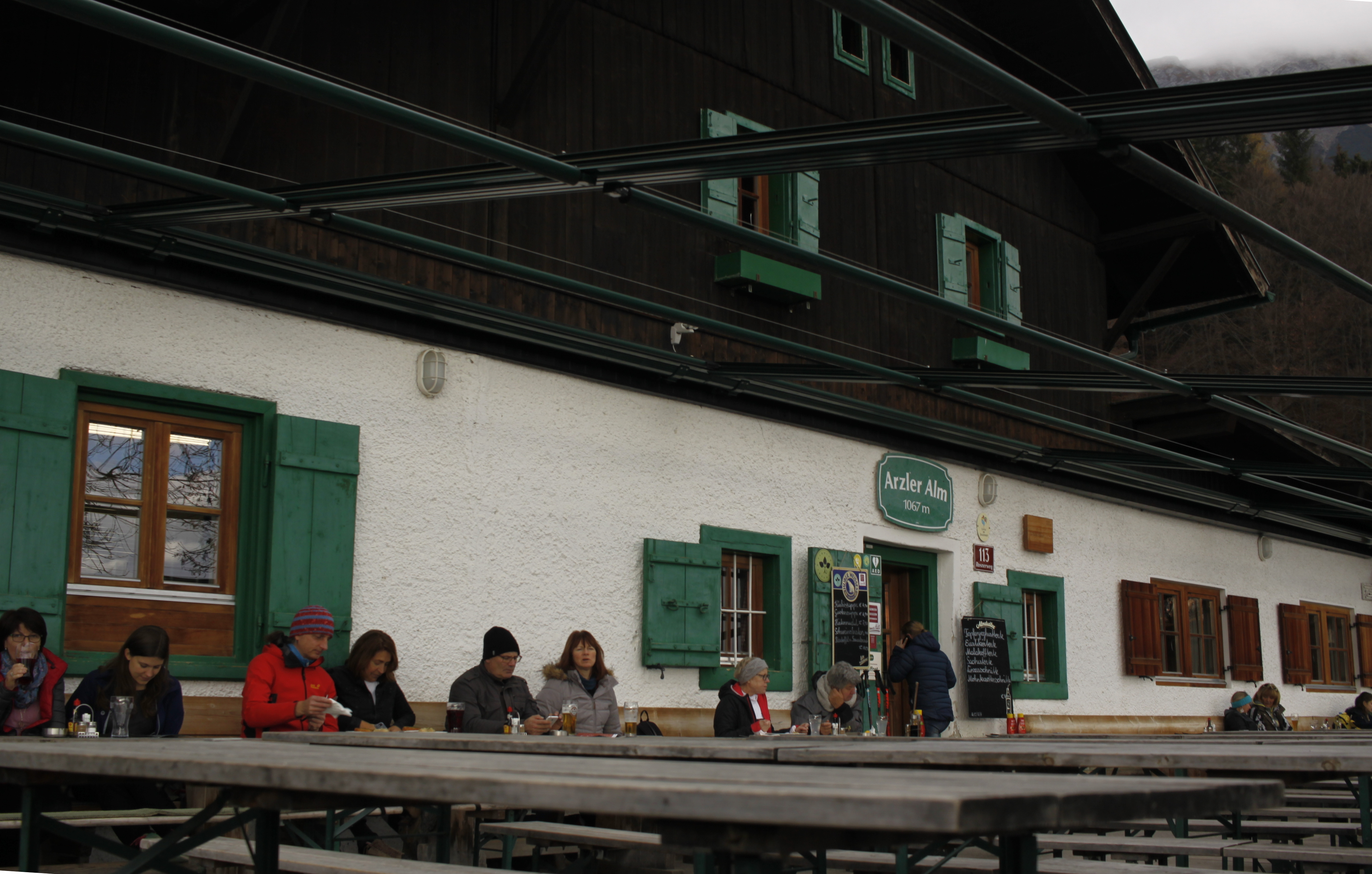 Odpoczynek pod Arzler Alm (1067 m). Byliśmy tam jedynymi turystami w nieturystycznych strojach. I z wózkiem zamiast nosidła.