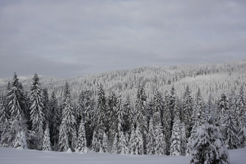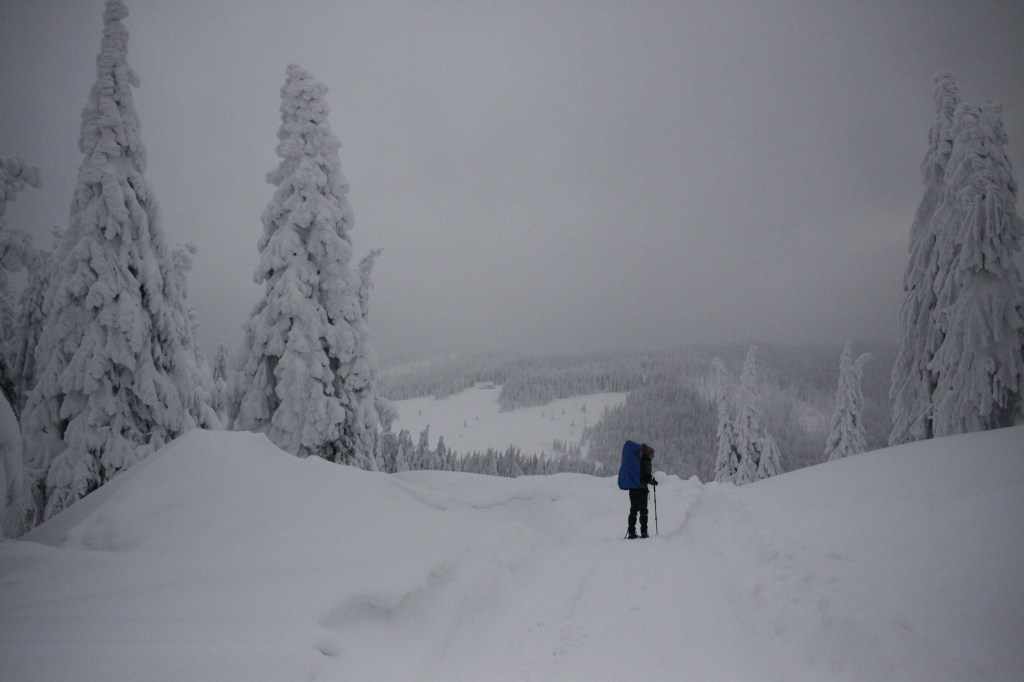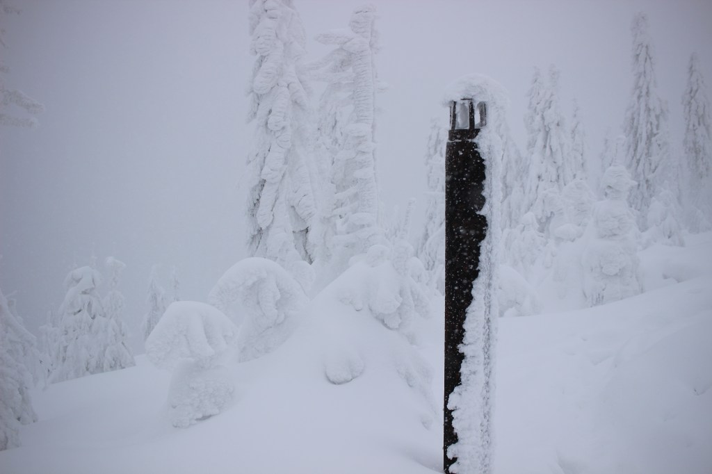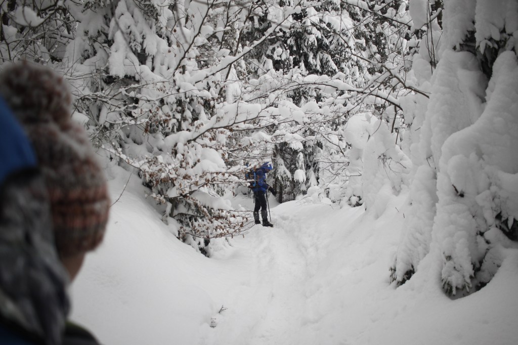 - szlak czerwony ze schroniska na szczyt Turbacz – ledwie 500 metrów i 32 metry podejścia, cały czas w lesie, ale to niełatwa trasa, w sobotę była ledwo przetarta, w okolicy szczytu dołożono trasery (drewniane tyczki ułatwiające orientację); śniegu było naprawdę dużo, dookoła szczytu zaspy miały metr wysokości (więc zasadniczo weszliśmy wyżej niż na szczyt 😛 ), a w drodze mieliśmy wrażenie, że omijamy komin jakiegoś domku…