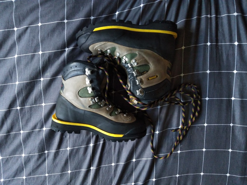 Podstawa to buty. Moje to Meindl Air Revolution 9.0, wysokie, ze sztywną podeszwą, przystosowane do raków półautomatycznych, z membraną GTX. Kupiłam je używane, na OLXie, i zapłaciłam połowę tego, ile kosztują nowe buty tego typu. Zdecydowałam się na taki zakup, bo na zwykłe wyjazdy górskie również noszę Meindle, więc wiedziałam, jakiego rozmiaru szukam, jeśli chodzi o tę firmę. Z racji doświadczenia (pracowałam swego czasu z sklepie z odzieżą turystyczną) wiedziałam też, w jakie inne marki mogę celować, a które lepiej omijać przy moim typie stóp. Niestety, jeśli ktoś kupuje pierwsze buty trekkingowe, to powinien raczej udać się do sklepu i spędzić tam kilka godzin (tak, godzin!) próbując różne marki i modele, żeby mieć pojęcie o tym, jak układają się na jego stopie.