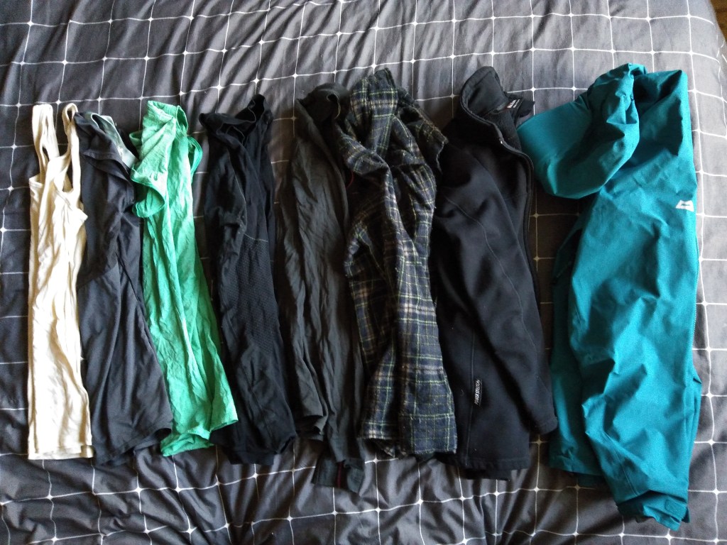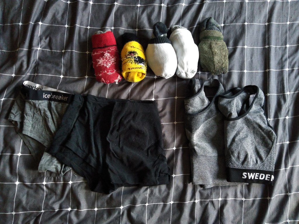 Skarpety to cztery grube pay trekkingowe kupione przy różnych okazjach plus jedna bawełniana, którą dostałam na święta. Ta jedna para będzie mi służyć jako zapas. Majtki 2x wełna merino + 1x syntetyk. Staniki to syntetyki. Jedna para majtek kupiona na wyprzedaży w sklepie internetowym, cała reszta używana (OLX/second hand).