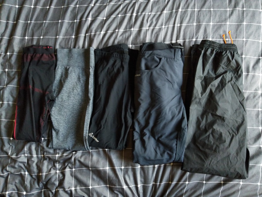 - spodnie wodoodporne, cienkie i lekkie, kupione w Decathlonie (to akurat jest model w wersji męskiej, w dziale damskim nie było tego typu, a nie chciałam szukać wersji damskiej w innych sklepach – szkoda życia).