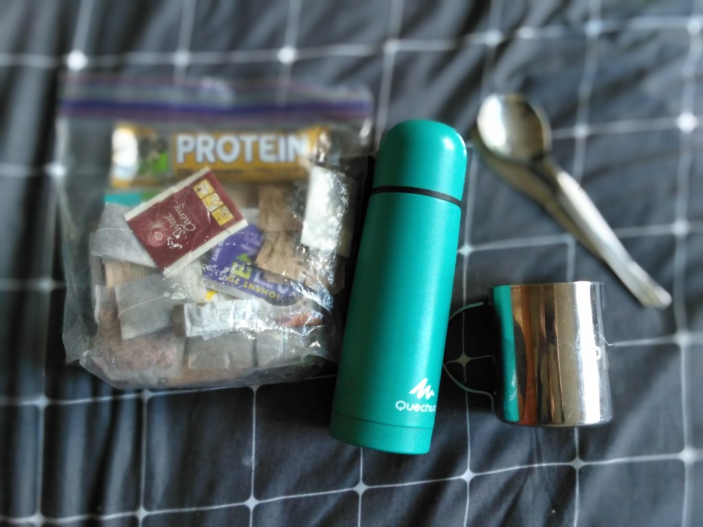Wyjazdowy standard. Kubek i termos (pożyczony), łyżka do zup/owsianek/kisieli/budyniów itp., nóż do smarowania chleba kremem czekoladowym/masłem orzechowym (domowej roboty). Oprócz tego batony muesli i proteinowe oraz suszone owoce. Kawa, herbata oraz – nasze widzimisie – składany lejek i filtry (żeby nie pić kawy rozpuszczalnej 😛 ).