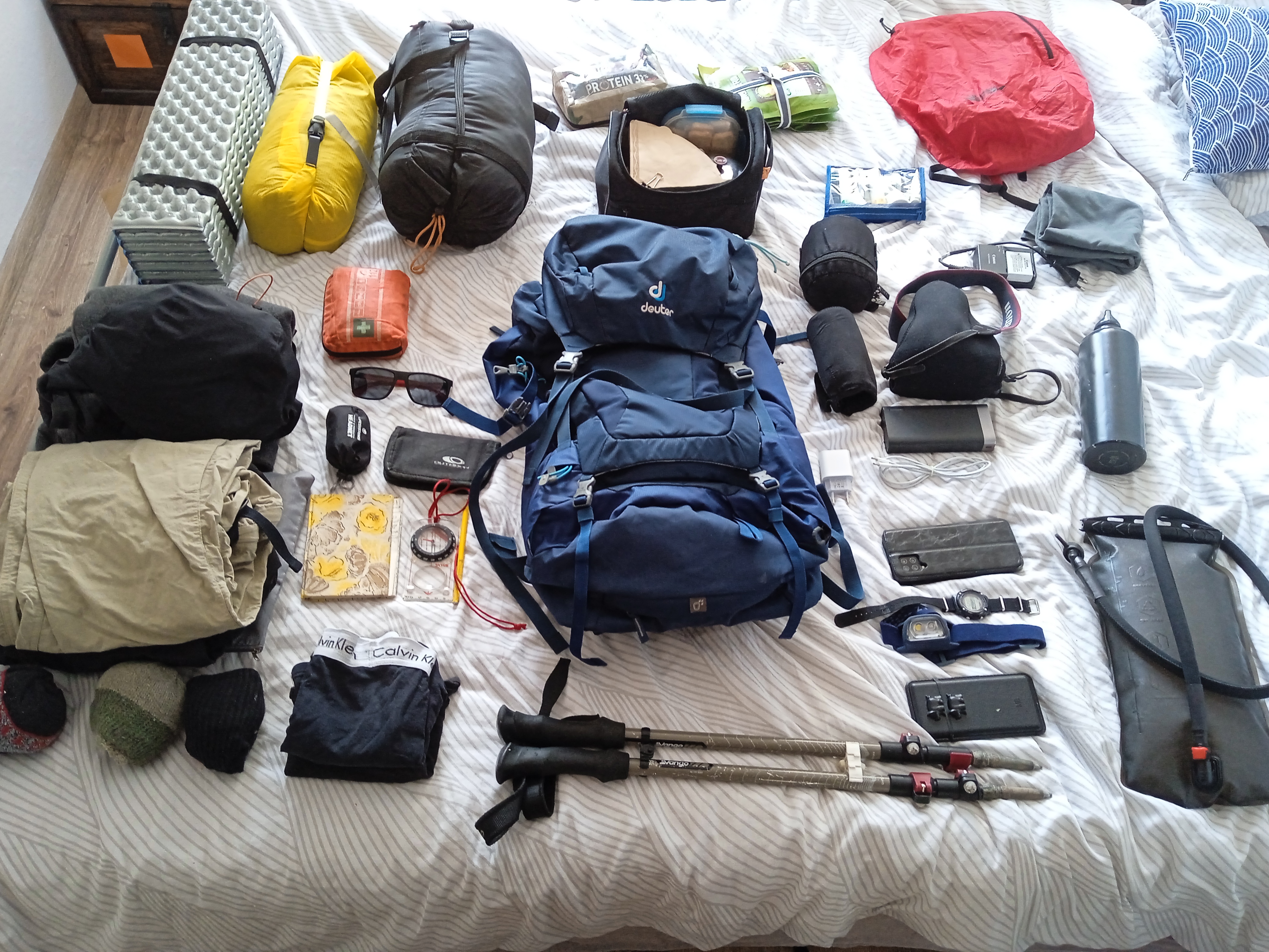 To by było na tyle. Po pierwszym pakowaniu plecak Marcina ważył niemal 18 kg, a mój tylko 14, więc zrobiliśmy przepakowanie, przemyślenie i redystrybucję niektórych przedmiotów. W efekcie mamy dwa plecaki po 14,5 kg (bez wody, ale za to z butami i wszystkimi ubraniami w środku), a w razie czego znów możemy się zamienić niektórymi rzeczami.