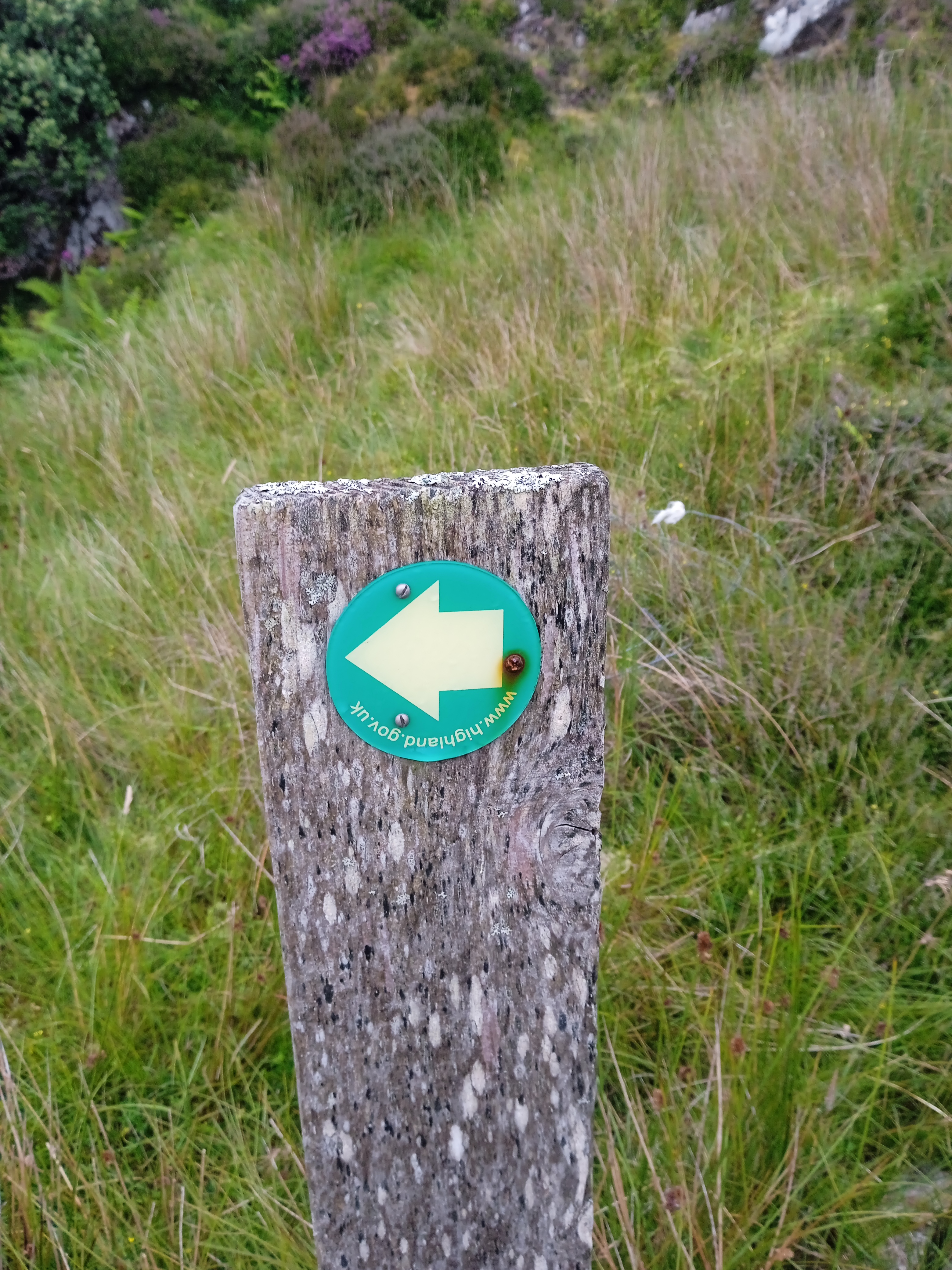 Na pierwszym etapie od czasu do czasu pojawiają się drogowskazy oraz słupki z zielonymi strzałkami Highland Council. Mimo to łatwo zejść z głównego szlaku, bo na całej Skye jest mnóstwo ścieżek wydeptanych przez owce, a i ludzie tworzą (świadomie lub nie) odnogi. Te odnogi czasem wiodą do jakiegoś ciekawego punktu widokowego, czasem omijają wyjątkowo mokre kawałki. Trzeba pamiętać, że te pastwiska to teren podmokły, przez większość trasy ma się uczucie chodzenia po gąbce. Nie ma tutaj typowego błota, raczej cała połać trawy zanurza się delikatnie, a na powierzchnię wypływa woda. Kluczem w nawigacji na Skye Trail jest trzymanie się brzegu wzgórza, jeśli jesteście daleko od klifu, to prawie na pewno zeszliście ze szlaku.