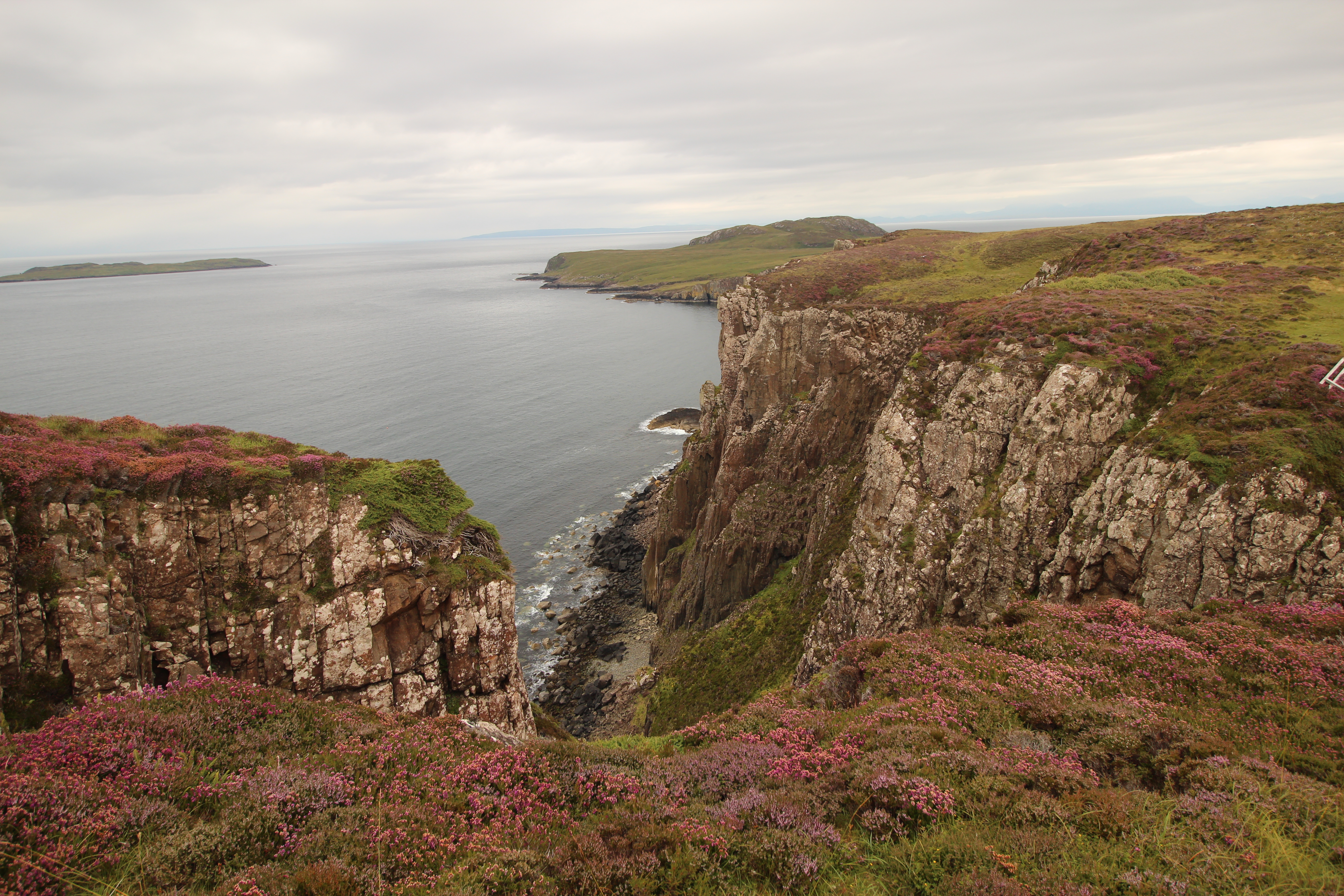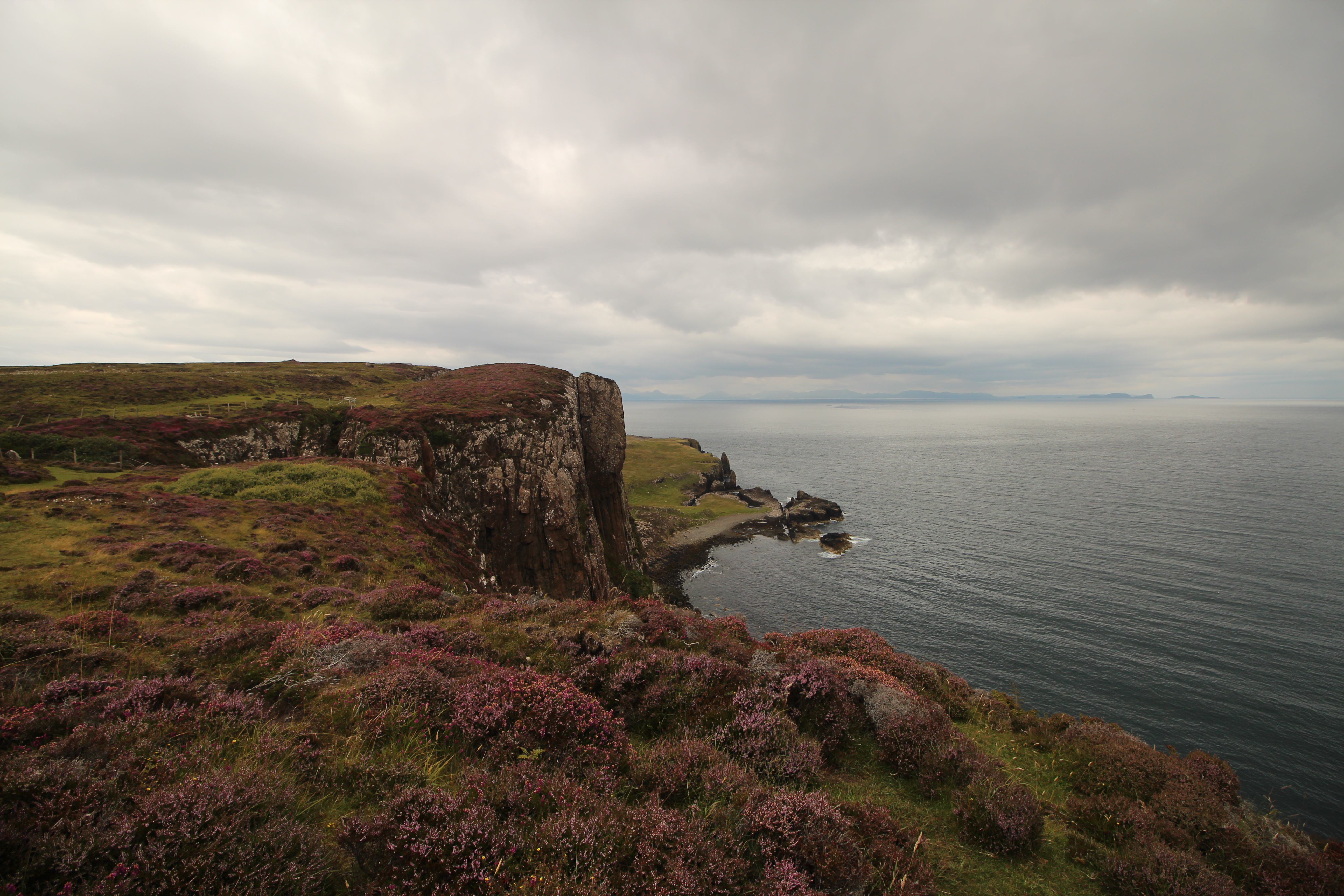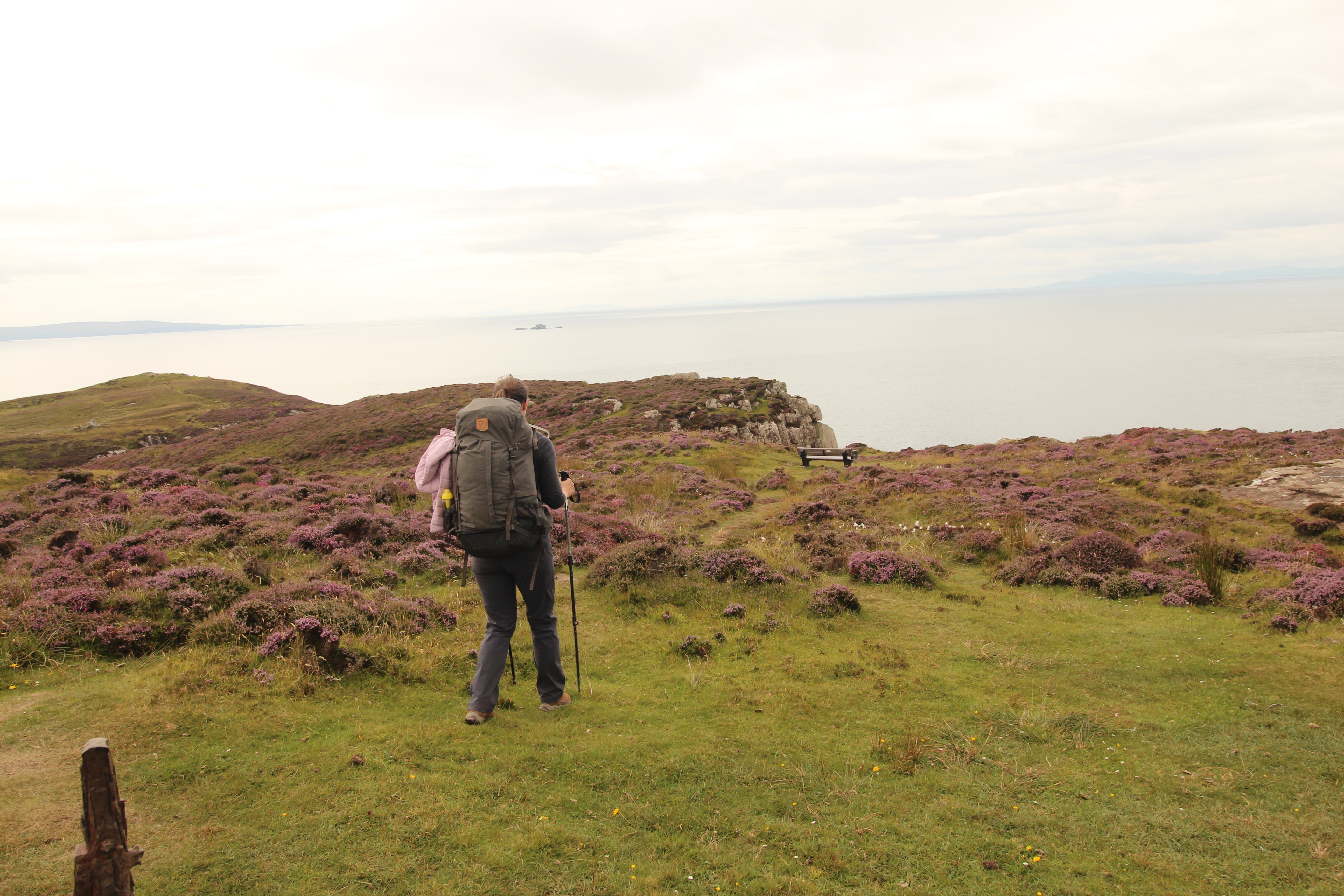 Cechą charakterystyczną okolic tego przylądka są wrzosy, które już teraz, w lipcu, pięknie kwitły, cały czas słychać też było wśród nich brzęczenie pszczół. Innym elementem, który przewijał się co jakiś czas na tym pierwszym etapie były pozostałości kamiennych domów. Ich mieszkańcy zostali wysiedleni w latach 1750-1860, a ich miejsce zajęły… owce! Tak, białe puchate zwierzątka przynosiły dużo więcej zysku, więc okoliczne tereny masowo zamieniano na pastwiska i, w zasadzie, tak pozostało do dziś. Owce są wszędzie i Skye Trail wiedzie w jakichś 95% przez pastwiska, natomiast jadąc przez Highlands widać, że wszystkie wzgórza są pocięte ogrodzeniami i usiane owcami.