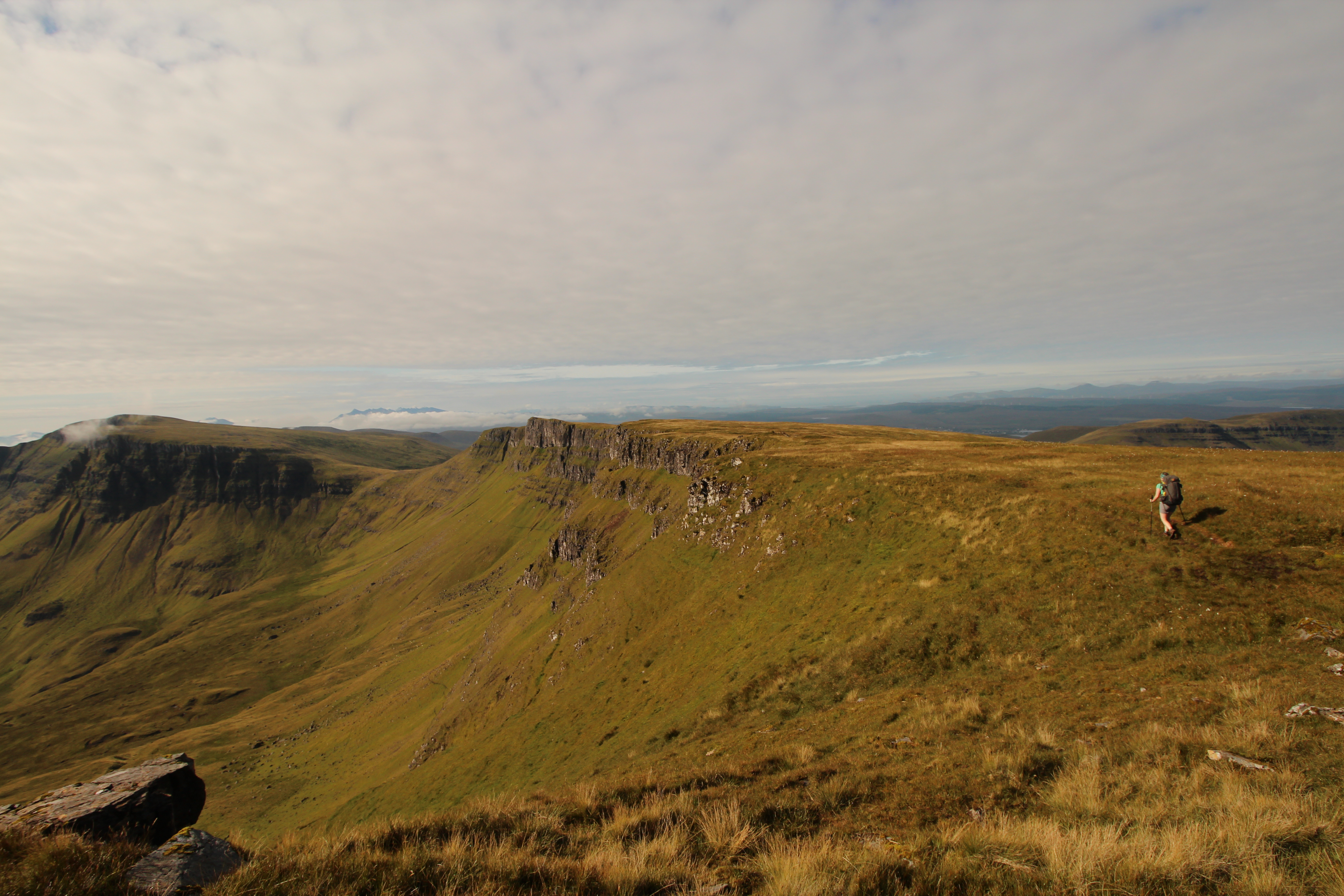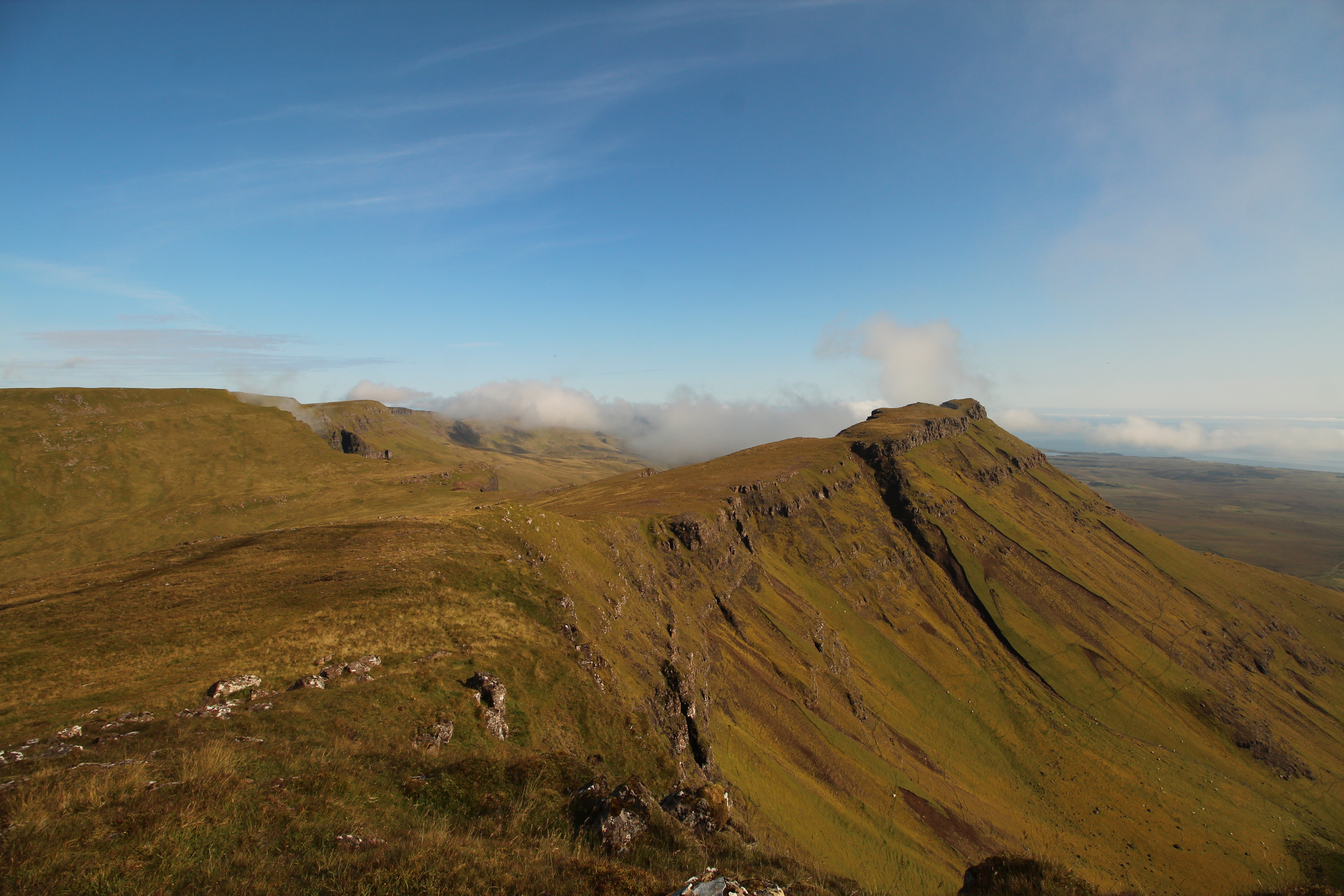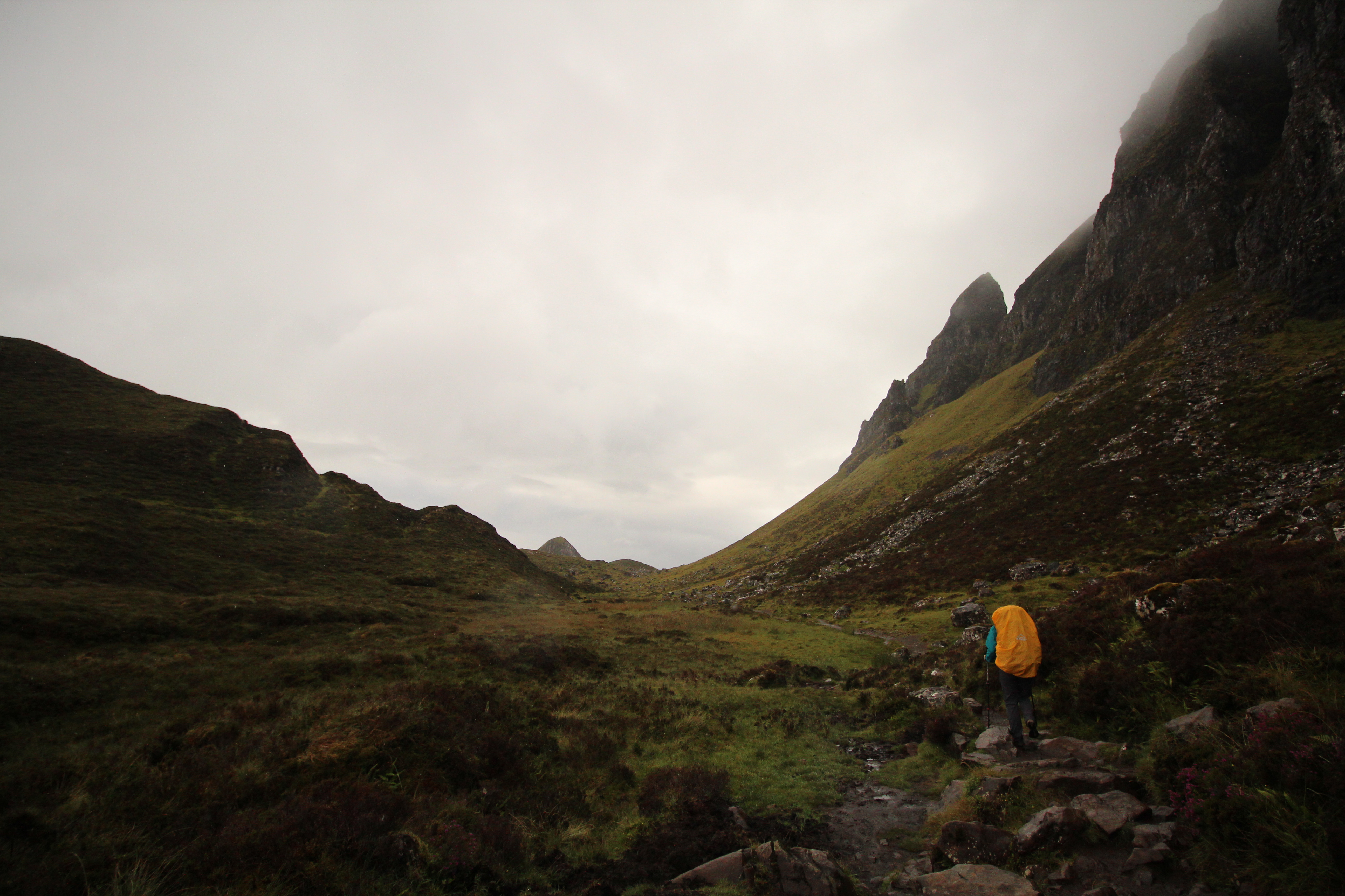 Za parkingiem czekało nas kilka ładnych godzin marszu wzdłuż urwisk na wzgórzach Trotternish. Jeśli tylko nie przepływa przez nie chmura, to widoki robią wrażenie. Cała trasa to właściwie (zanikająca momentami) ścieżka przez podmokłe pastwiska. Szczerze mówiąc, nie spodziewałam się aż takiego stopnia rozmięknięcia, ale nie jest to bieszczadzkie błoto, więc nie jest najgorzej. Po drodze minęliśmy kilka osób, ale kiedy dotarliśmy do przełęczy między Flasvein a Creag a’ Lain (17 km), stwierdziliśmy, że pora na dłuższą przerwę. Byliśmy już zmęczeni ciągłymi podejściami, a do tego znaleźliśmy stary mur otaczający pastwisko. Kupa kamieni (szczególnie ułożona przez kogoś innego) stanowiła idealną osłonę namiotu przed wiatrem. Jednocześnie, to właśnie dzięki wiatrowi spaliśmy w suchym namiocie (który rano zwijaliśmy mokry po deszczu).