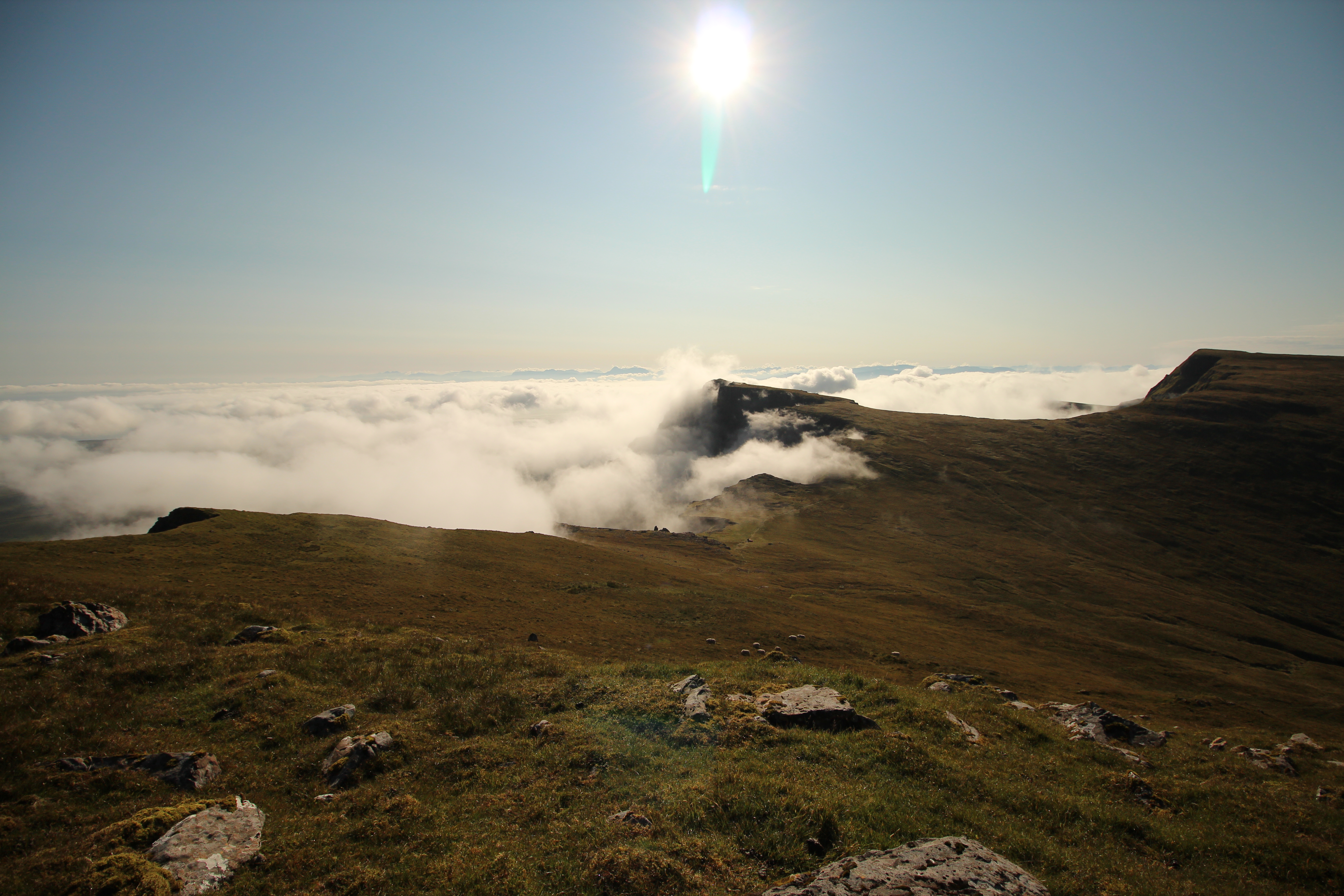 Trzeci dzień rozpoczęliśmy od pięknego wschodu słońca nad wzgórzami Trotternish. Poranne mgły unosiły się już i przepływały przez przełęcz. Wszystko pokryte było rosą, ale chcieliśmy wyjść ok. 8, więc po śniadaniu i pakowaniu zwinęliśmy znów mokry namiot. Pierwsze podejście na wzgórze od razu uświadomiło nam, że to będzie ciepły dzień. Po mgłach prawie nie było śladu, a słońce zaczynało prażyć, więc zrobiliśmy przerwę na zdjęcie zbędnych warstw (ja nawet zmieniłam spodnie na krótkie). Nie muszę chyba dodawać, że widoczność była doskonała w każdym kierunku. To były widoki, po które przyjechaliśmy na Skye.