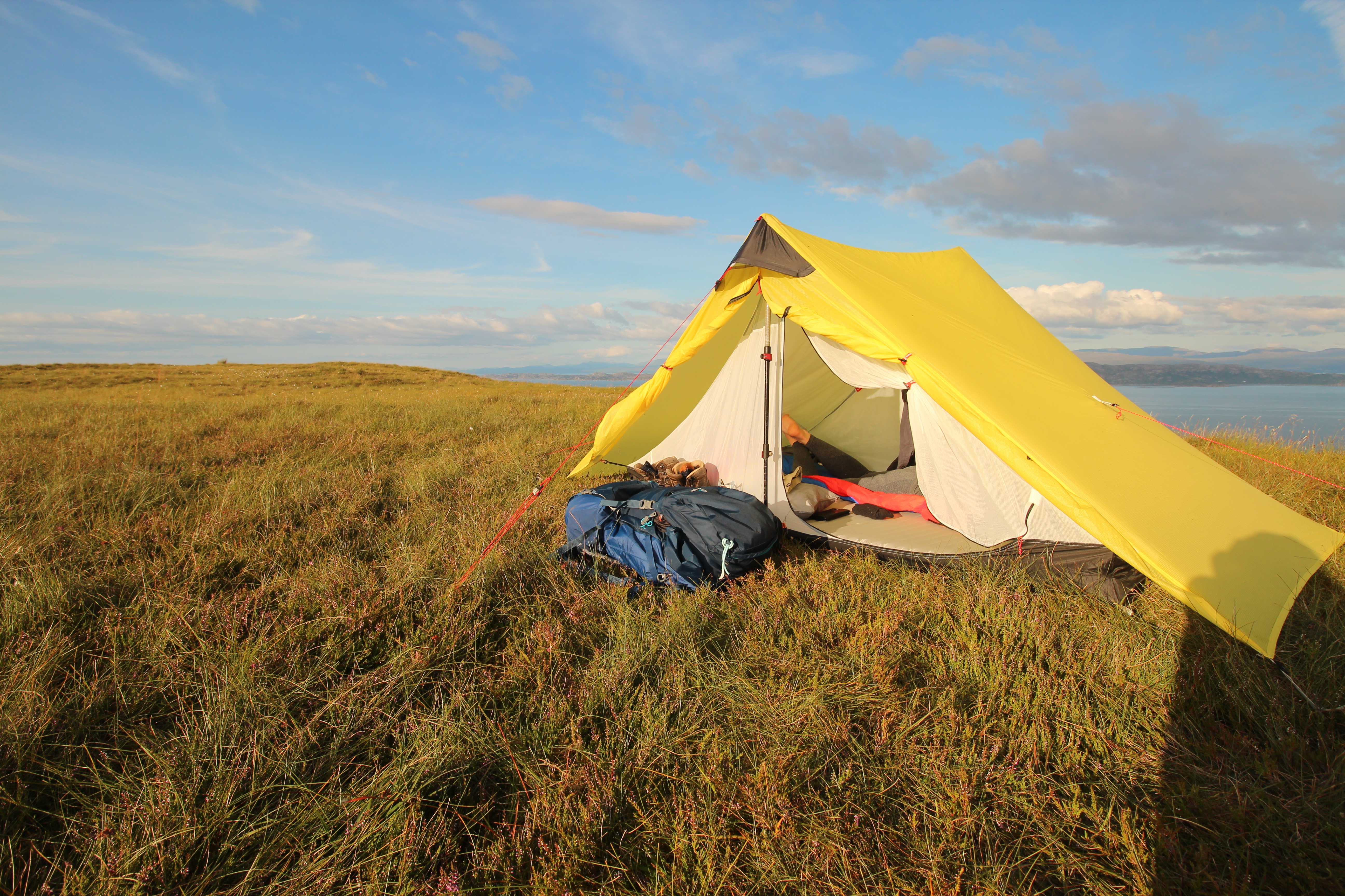 Po postoju zdecydowaliśmy się rozpocząć etap trzeci i ruszyliśmy w stronę Portree, najpierw drogą wiodącą do tamy, a potem wzgórzami wzdłuż wybrzeża. Po 3 kilometrach rozbiliśmy obozowisko na noc. Skorzystaliśmy ze słońca i wysuszyliśmy mokre ubrania oraz namiot, do którego dość szybko się schowałam – okazało się, że podczas marszu doszczętnie spaliłam nogi, a poza tym wiatr znad morza był dla mnie za chłodny, kiedy już nie szłam pod górę z kilkunastokilogramowym plecakiem.