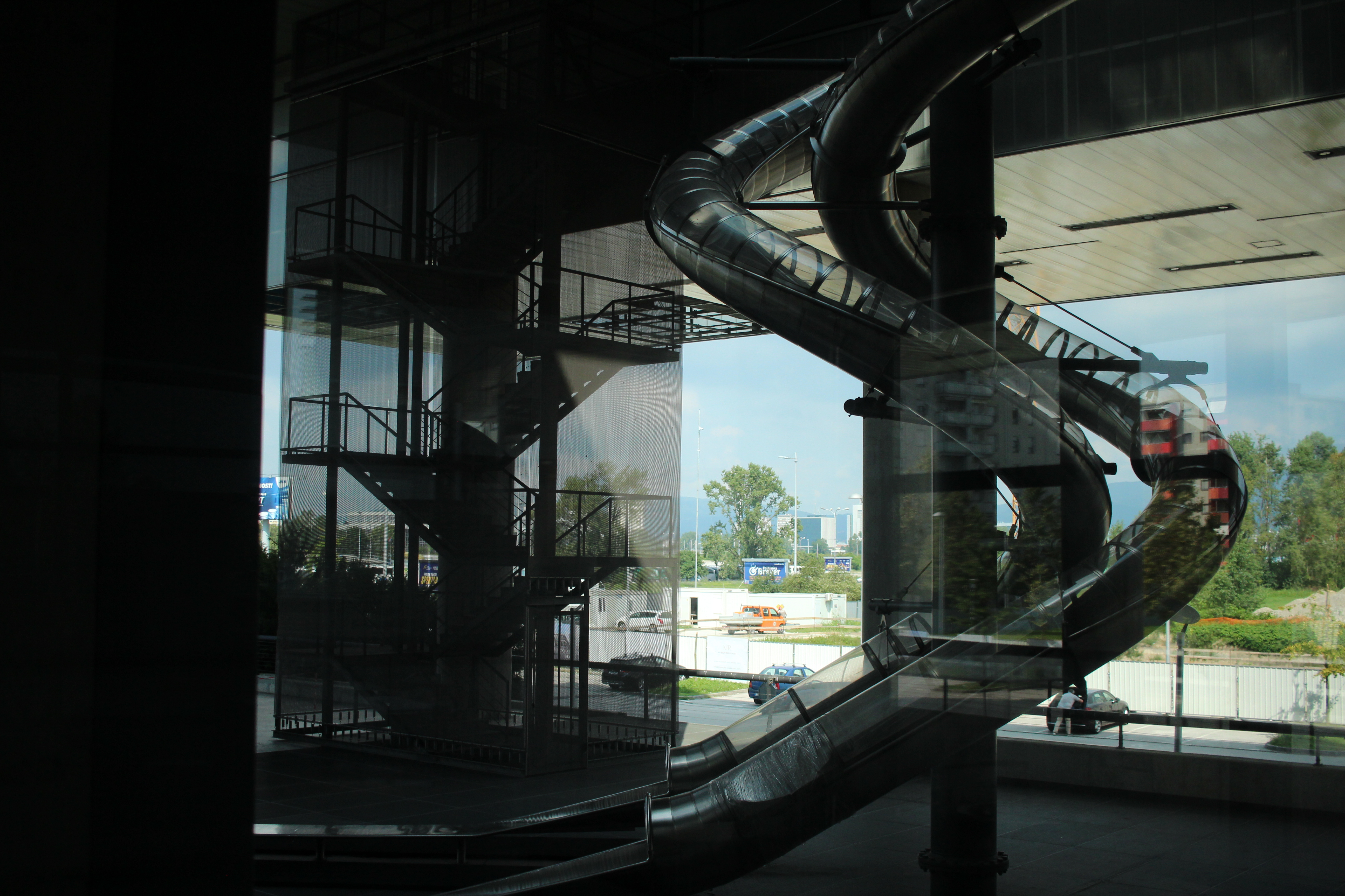 Na kolejny punkt dnia wybraliśmy Muzeum Sztuki Współczesnej. Powodów takiego wyboru było kilka. Po pierwsze, muzeum otwiera się o 11, a z Mirogoju wyszliśmy akurat ok. 10:40, więc wiedzieliśmy, że dotrzemy tam jako jedni z pierwszych zwiedzających i nie będziemy musieli spacerować w tłumie. Po drugie, chcieliśmy pobyć w środku dnia w klimatyzowanym miejscu. A po trzecie, liczyliśmy na zainteresowanie chłopców eksponatami oraz ogromną zjeżdżalnią dostępną na miejscu. O ile sztuka zrobiła pewne wrażenie na naszych potomkach, to główna atrakcja okazała się niewypałem – zjeżdżalnia z niewiadomych powodów była zamknięta.