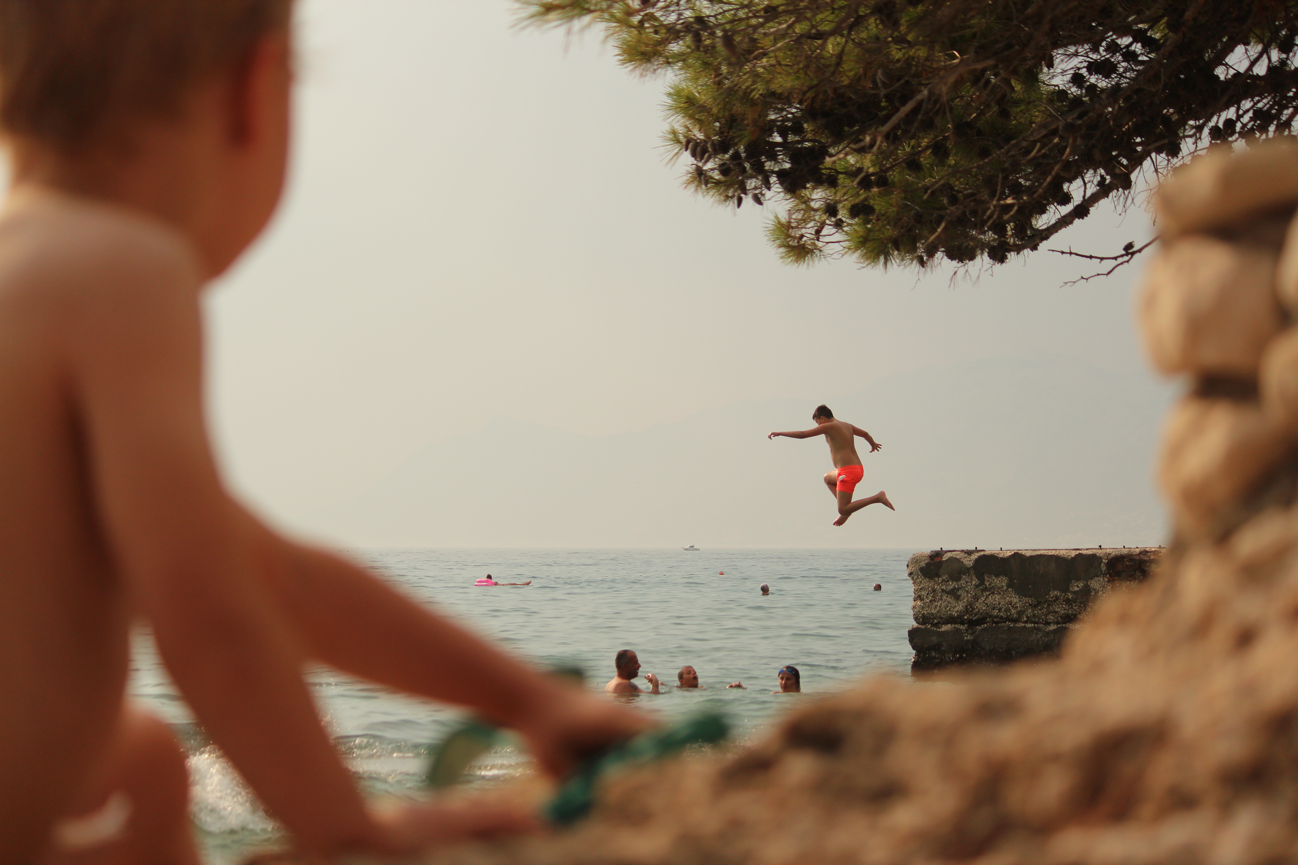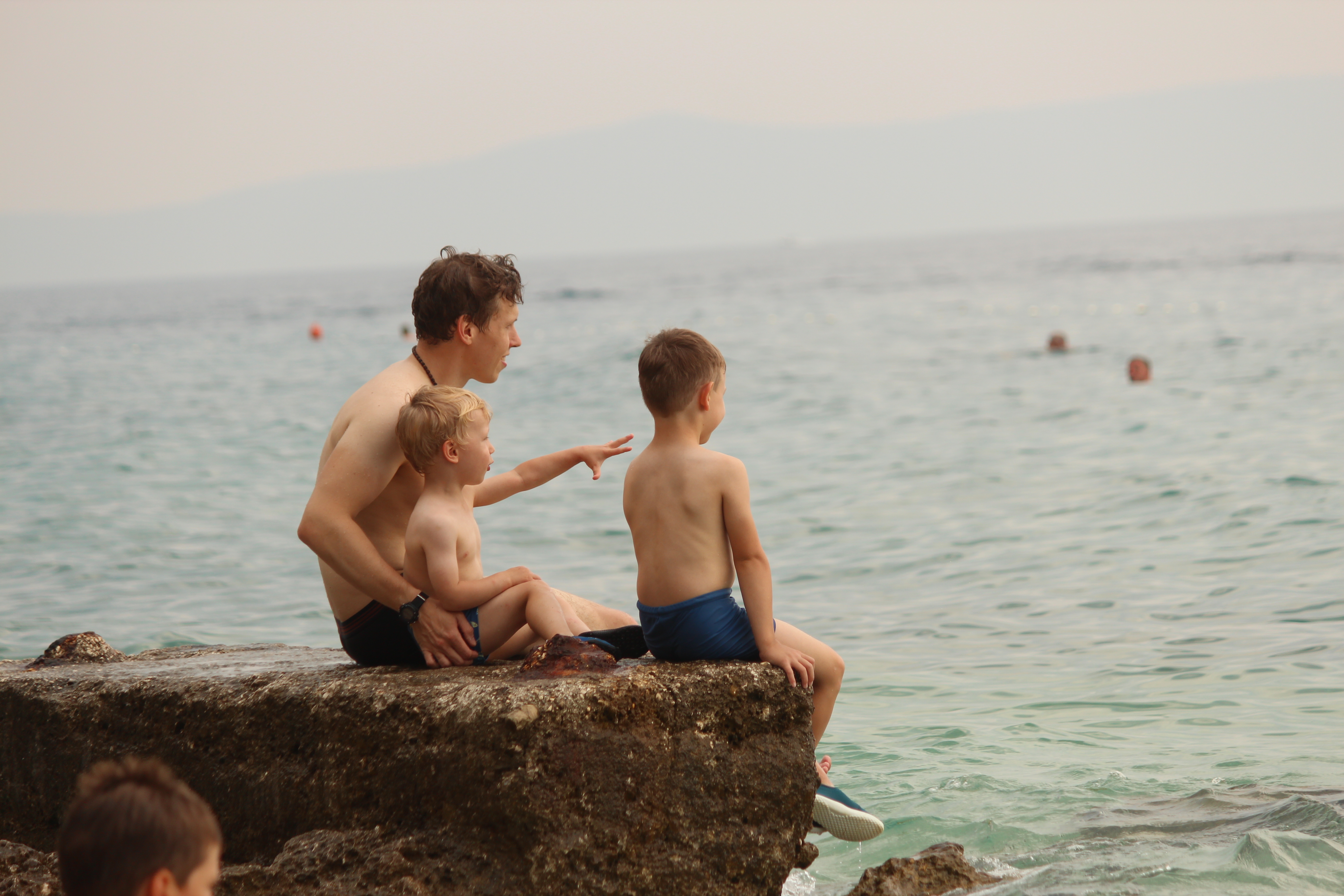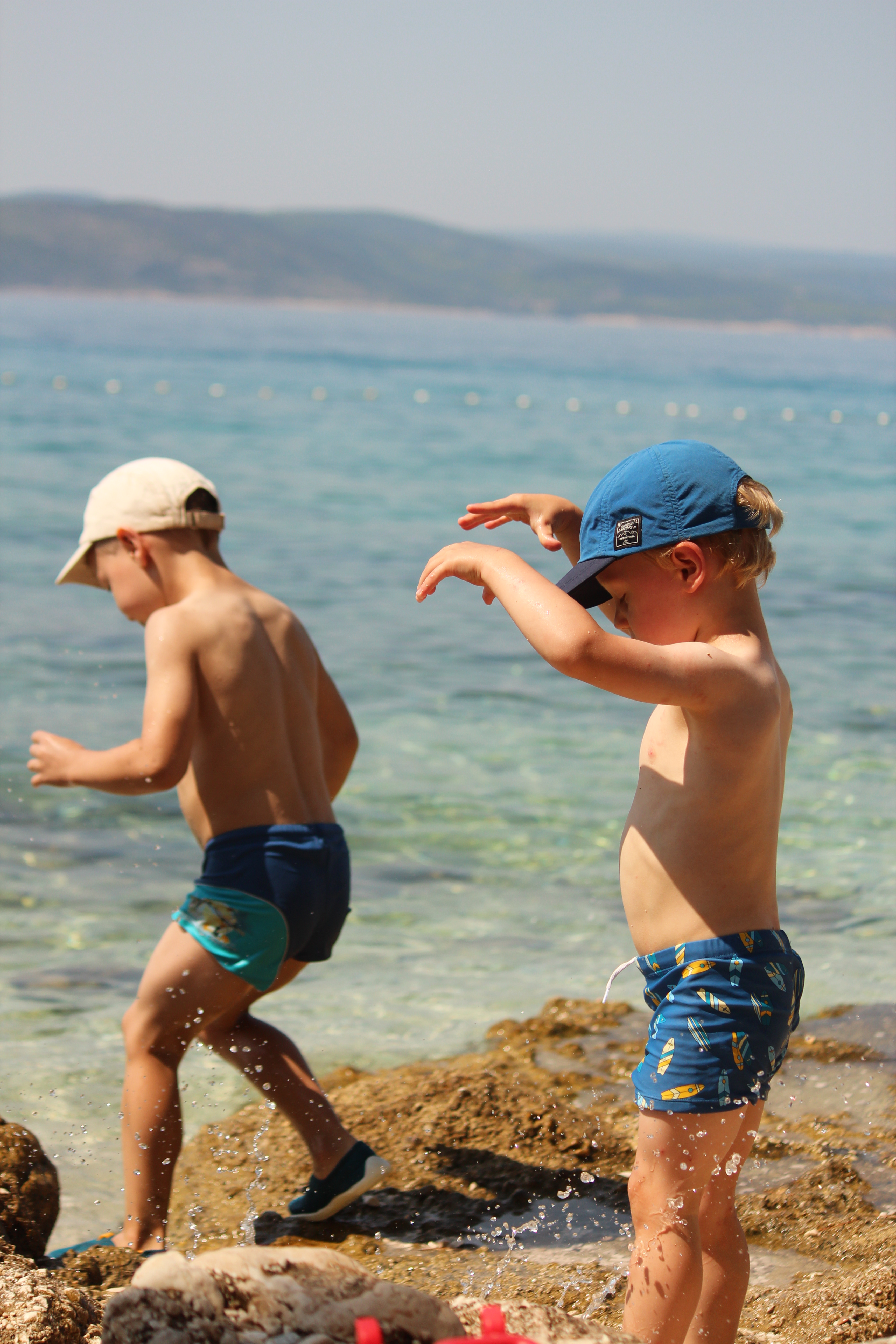 Na plaży również nie było nudno. Szpadelki i wiaderka nadają się świetnie nie tylko do piasku, ale i do kamieni, z których można układać ciekawe konstrukcje. W przejrzystym morzu można obserwować rybki, a na skałach znaleźć kraby. W porannych godzinach wzdłuż do brzegu przybija łódka ze świeżymi owocami. No i sama woda jest na tyle ciepła, że kąpiel jest czystą przyjemnością – niech dowodem będzie to, że ja regularnie pływałam. Zyzio jak zwykle spędził w wodzie jakieś 99%, nawet Stefcio, kiedy już się oswoił, bardzo chętnie brykał wśród delikatnych fal. Jeśli chodzi o dzieci, to myślę, że kluczem do sukcesu były buty do wody, które gwarantowały zabawę niezmąconą kłującymi w stopy kamykami (a to był problem, szczególnie dla Stefka, w zeszłym roku w Słowenii).