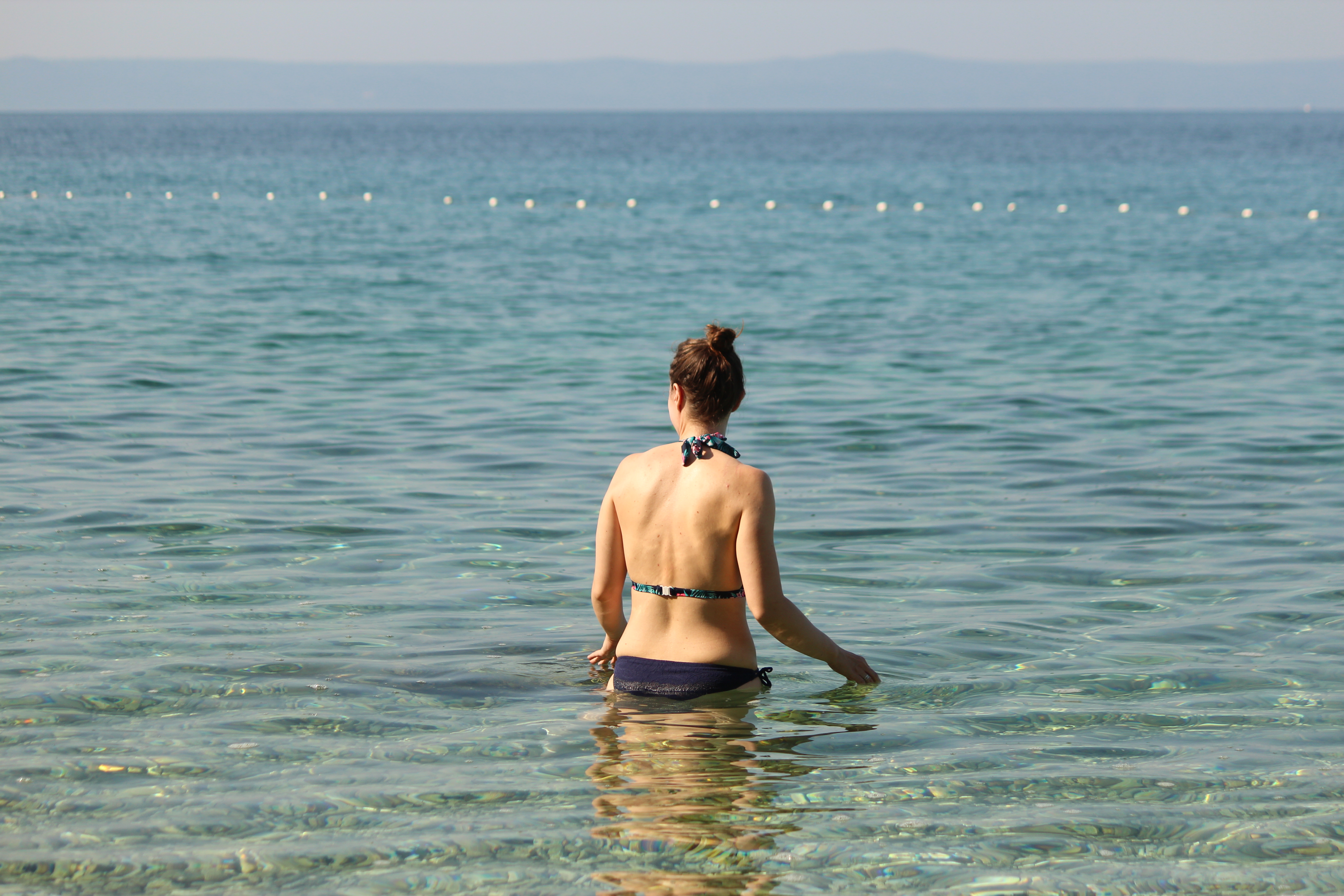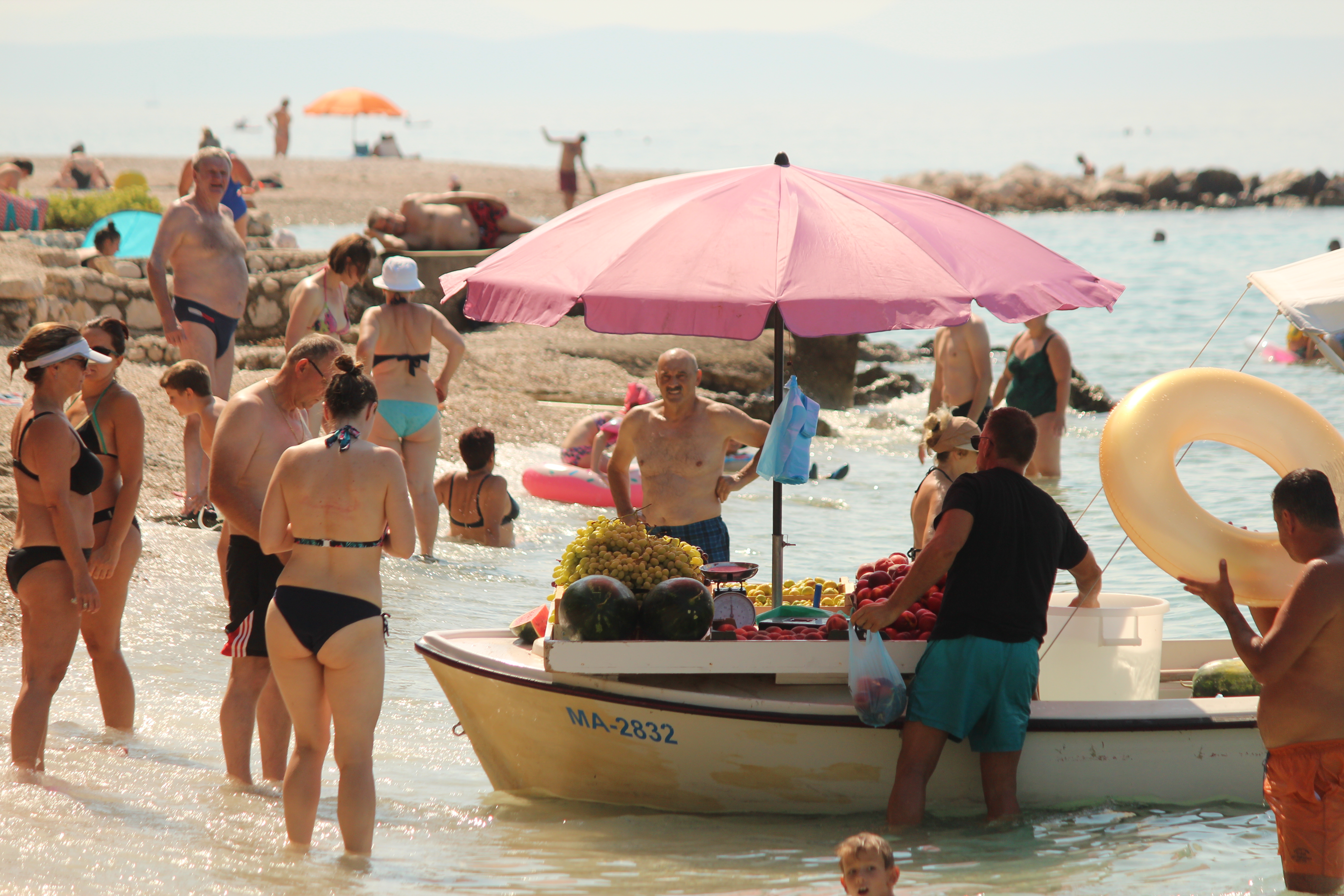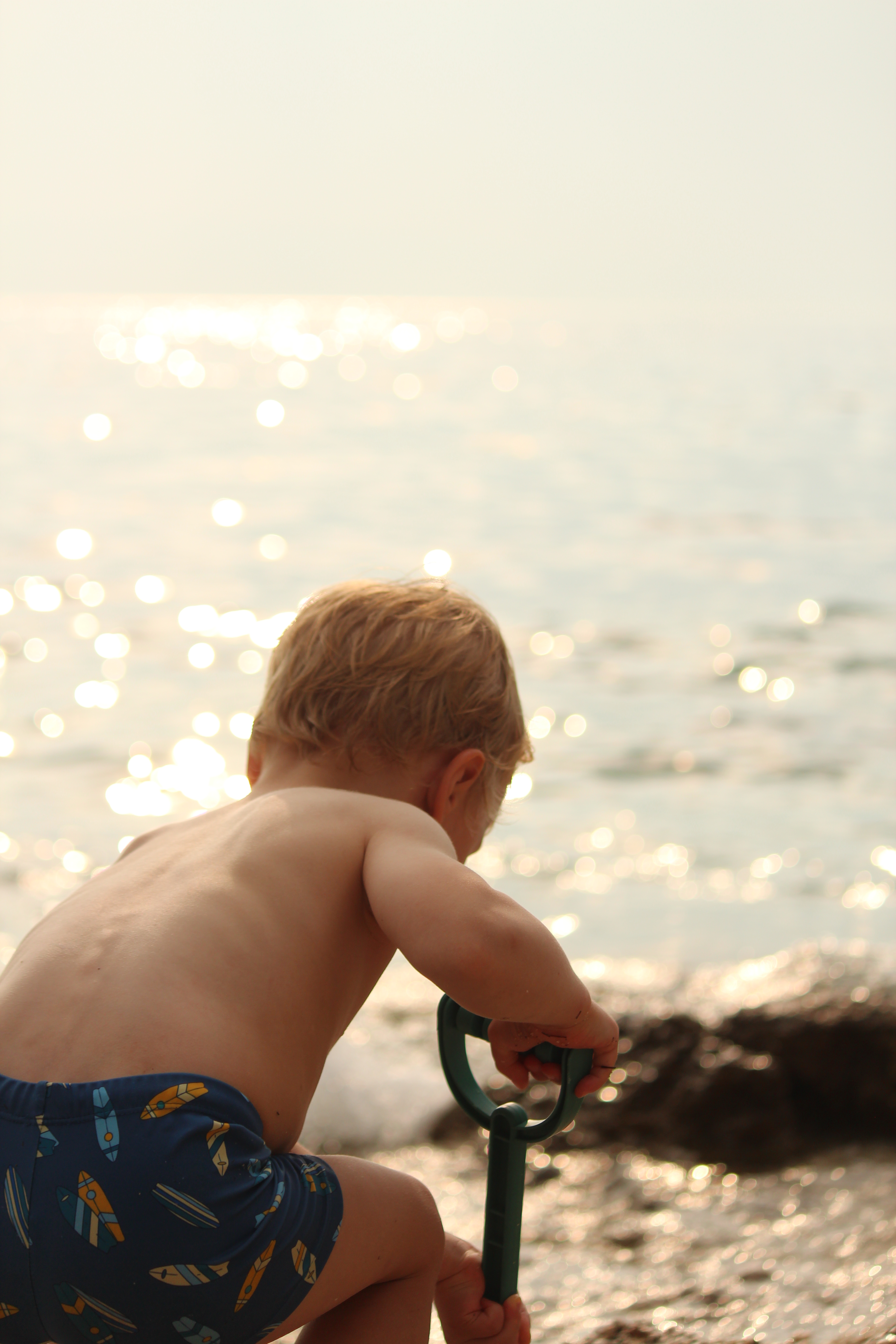Na plaży również nie było nudno. Szpadelki i wiaderka nadają się świetnie nie tylko do piasku, ale i do kamieni, z których można układać ciekawe konstrukcje. W przejrzystym morzu można obserwować rybki, a na skałach znaleźć kraby. W porannych godzinach wzdłuż do brzegu przybija łódka ze świeżymi owocami. No i sama woda jest na tyle ciepła, że kąpiel jest czystą przyjemnością – niech dowodem będzie to, że ja regularnie pływałam. Zyzio jak zwykle spędził w wodzie jakieś 99%, nawet Stefcio, kiedy już się oswoił, bardzo chętnie brykał wśród delikatnych fal. Jeśli chodzi o dzieci, to myślę, że kluczem do sukcesu były buty do wody, które gwarantowały zabawę niezmąconą kłującymi w stopy kamykami (a to był problem, szczególnie dla Stefka, w zeszłym roku w Słowenii).