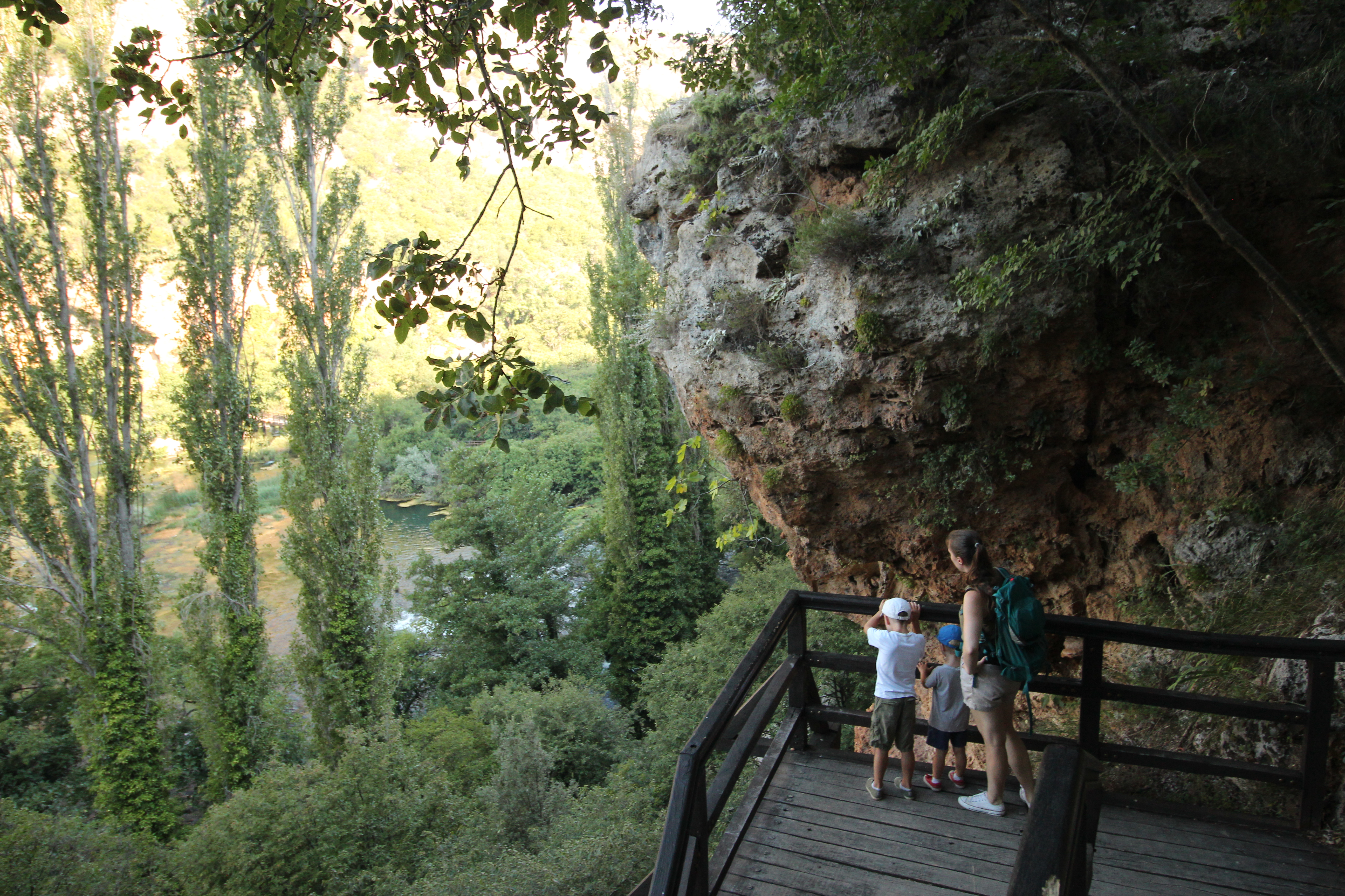 Zostawiliśmy samochód na parkingu w Bogatiću (na mapie w prawym górnym rogu, na początku szlaku czerwonego; na google maps ten parking jest podpisany jako „educational walking trail roski slap, WX5Q+XJ, 22324, Bogatić, Chorwacja”). Kamienistą drogą, a później schodami zeszliśmy w dół, po drodze zaglądając do jaskini Oziđana pećina. Doszliśmy do rzeki i wciąż wzdłuż czerwonego szlaku dotarliśmy do wodospadu Roškiego. Tuż przy nim znajdują się pozostałości młyna, a w nim ekspozycja pokazująca, jak był dawniej wykorzystywany. Od 10 można skorzystać ze skromnego bufetu, a o 10:30 spod wodospadu odpływa pierwsza łódka w stronę wyspy Visovac.