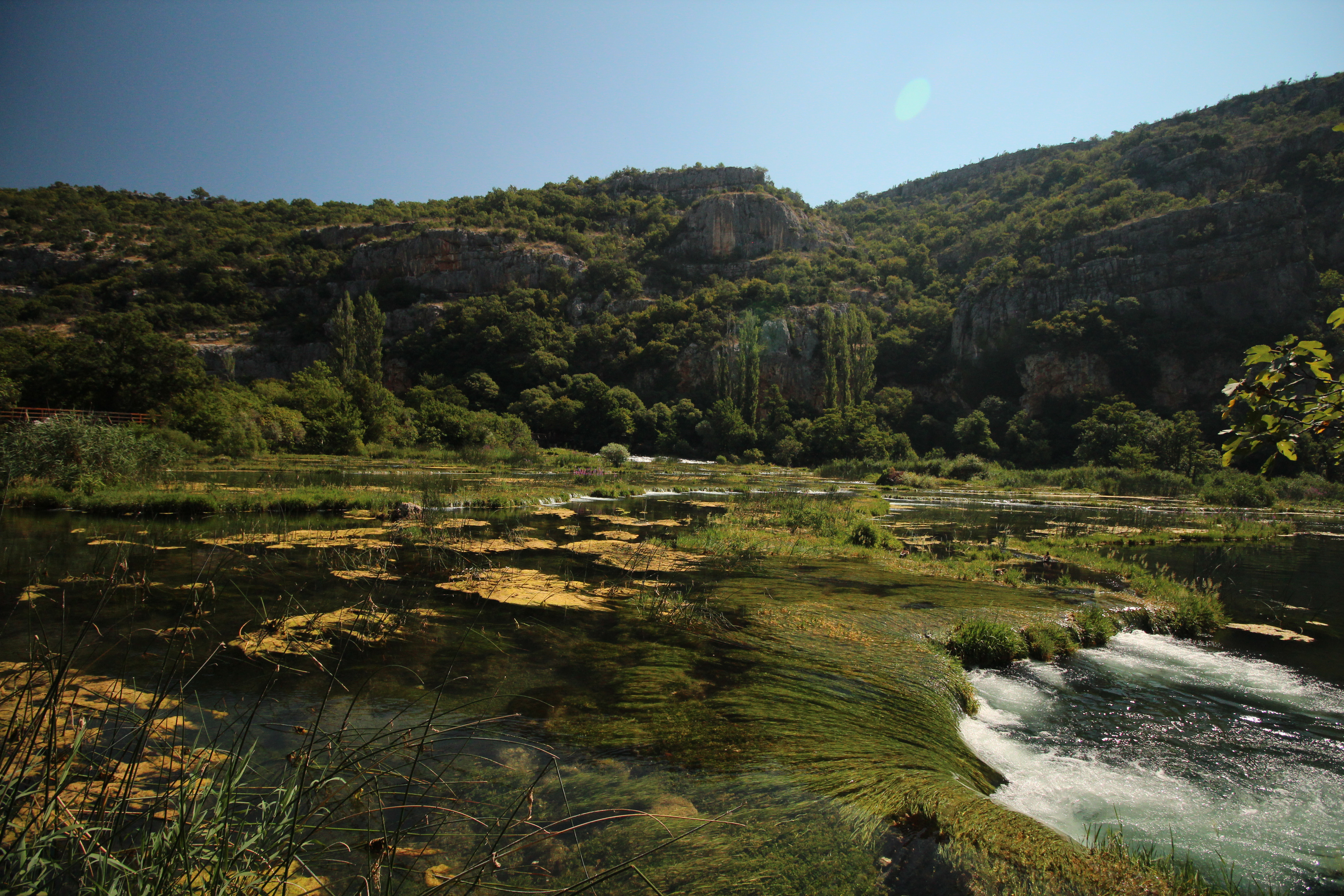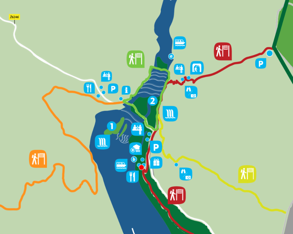 Sam wodospad jest na tyle daleko od punktu widokowego, że nie robi ogromnego wrażenia, natomiast zupełnie inaczej jest z kaskadami Ogrlice. Żeby do nich dojść, cofnęliśmy się w górę szlaku czerwonego i przeszliśmy mostem na drugą stronę rzeki. Dalej, wzdłuż zielonego szlaku, widoki są nieziemskie. Zarówno z brzegu rzeki jak i z drewniane mostu przecinającego rzekę nieco dalej na północ. Dodać trzeba jeszcze, że zwiedzających była jedynie garstka, a bujna roślinność dawała ulgę od palącego słońca. Idealna kombinacja na letni spacer, bo to właśnie w słońcu wszelkie załomy rzeki robią największe wrażenie.