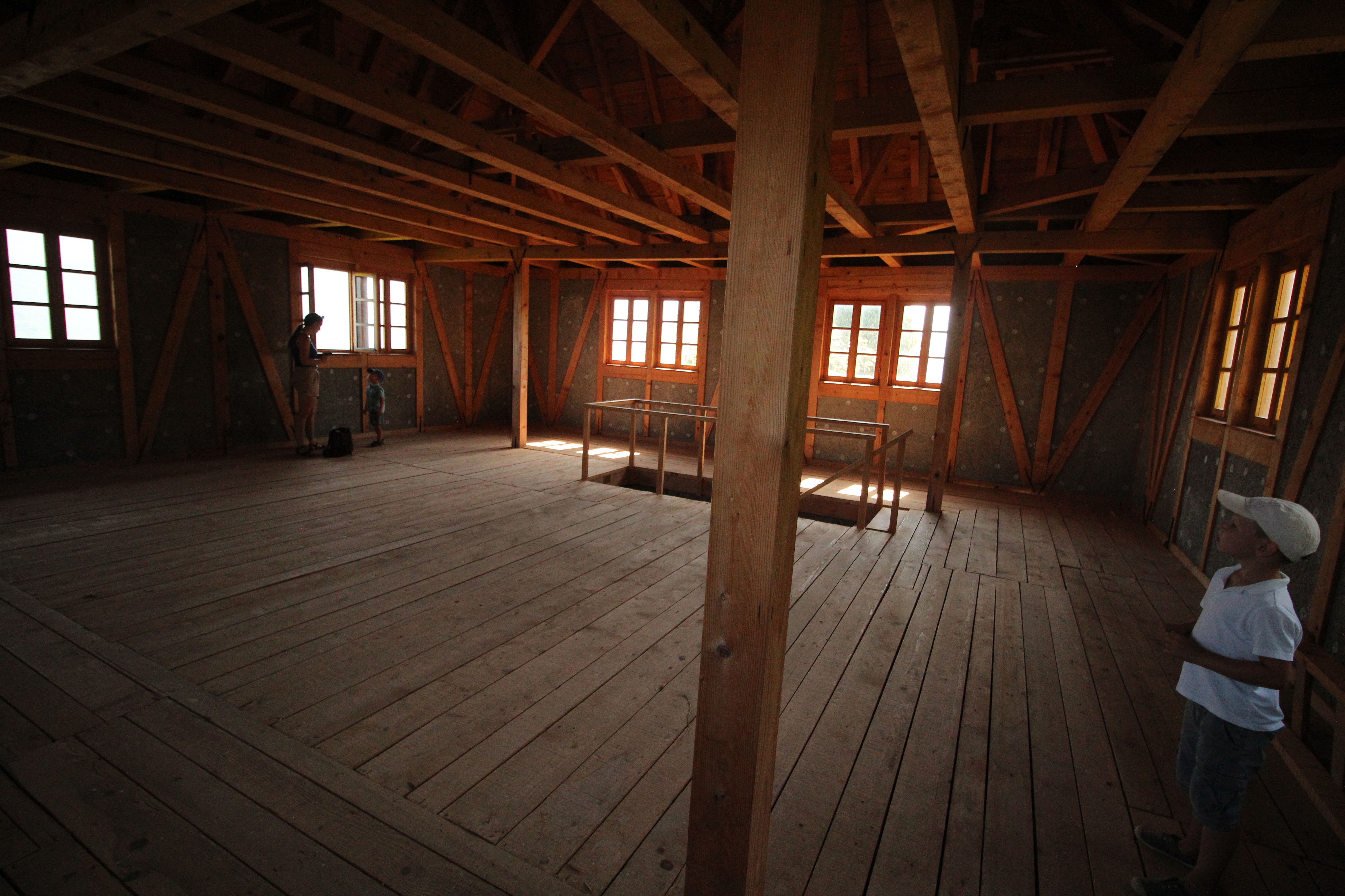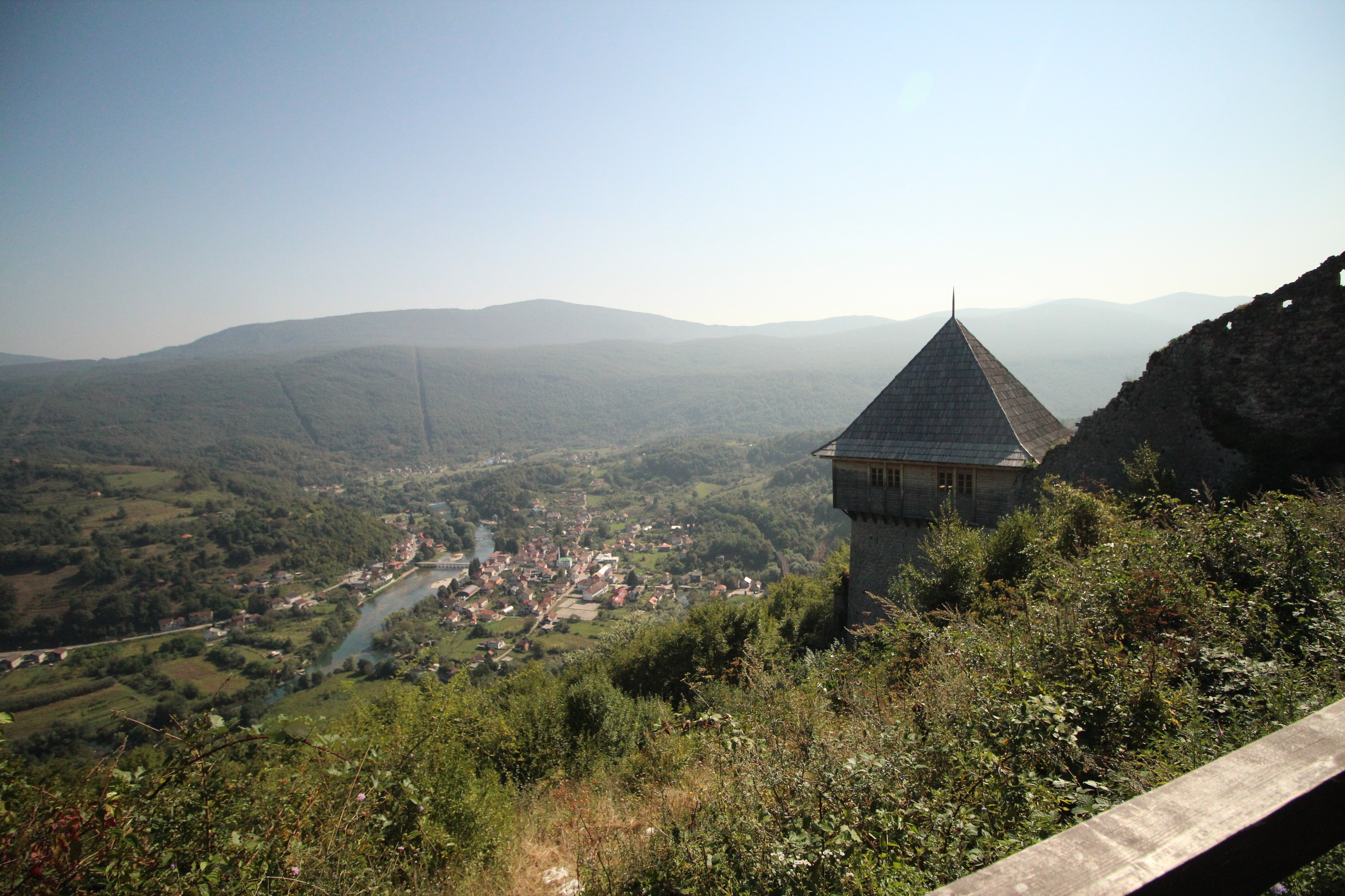 Dotarliśmy wreszcie na wzgórze zamkowe. Rozciąga się stamtąd doskonały widok na Kulen Vakuf oraz dolinę Uny. Po zejściu nieco w dół wschodniego stoku można znaleźć ławki z widokiem na miasteczko oraz boczną bramę (widać wyraźnie, że jej łuk został rekonstruowany). W środku, jak już wspomniałam, są tylko zarośla, ale wieża wyglądała z zewnątrz na tyle dobrze, że bardzo chcieliśmy znaleźć wejście do niej. Okazało się, że trzeba zejść dość stromą ścieżką wśród jeżyn (w sandałach to było spore wyzwanie, ale daliśmy radę) i w ten sposób można dojść do murowanej, dolnej części wieży, na którą prowadzi drewniany trap. W środku czuć wyraźnie zapach świeżego drewna – schody, piętra oraz więźba dachowa są zupełnie nowe. A z okien roztacza się jeszcze lepszy widok niż ze wzgórza. Wygląda na to, że jeszcze rok czy dwa, w powstanie tam jakaś ekspozycja czy przynajmniej sklep z pamiątkami.