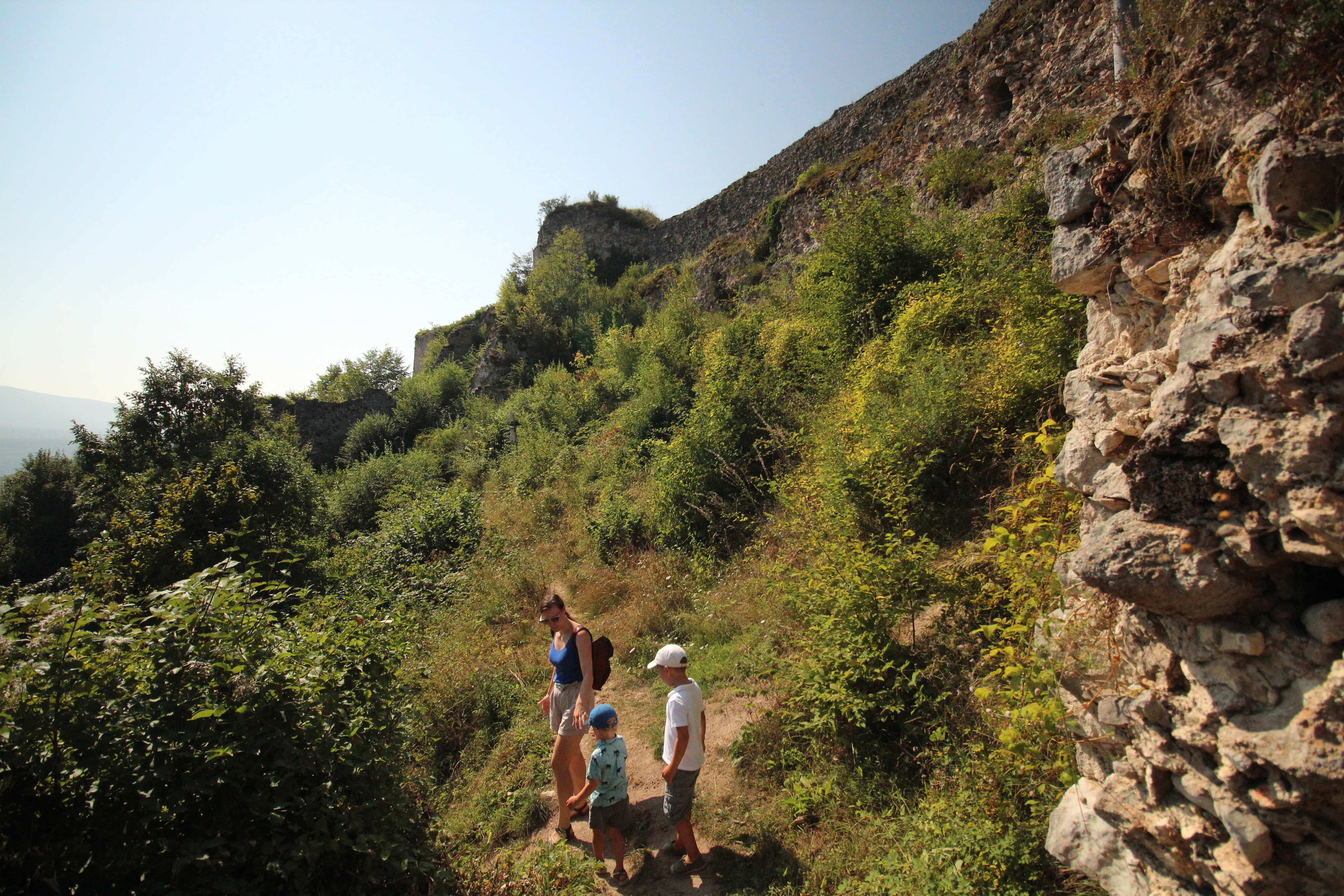 Google (który już wcześniej wpuścił nas w maliny na granicy bośniacko-chorwackiej) pewien siebie wskazywał, że możemy podjechać samochodem pod sam zamek. Ja odradzam to rozwiązanie, chyba że macie samochód terenowy. A nawet wtedy – będziecie po prostu intruzami w małej spokojnej wioseczce. Za rzeką jechaliśmy naprawdę stromą wąską drogą, na której miejscami brakowało asfaltu, i nieco powyżej Villi Ostrovica zaparkowaliśmy przy wiacie. Dalej wchodziliśmy już na piechotę po drodze gruntowej (gdzieniegdzie umocnionej betonem). Po drodze mijaliśmy spokojne domostwa (z pięknym widokiem na pola i góry w oddali), kilka malutkich cmentarzy (oczywiście muzułmańskich, z nagrobkami skierowanymi na wschód) i całe morze jeżyn (idealna zachęta dla młodszych członków rodziny).