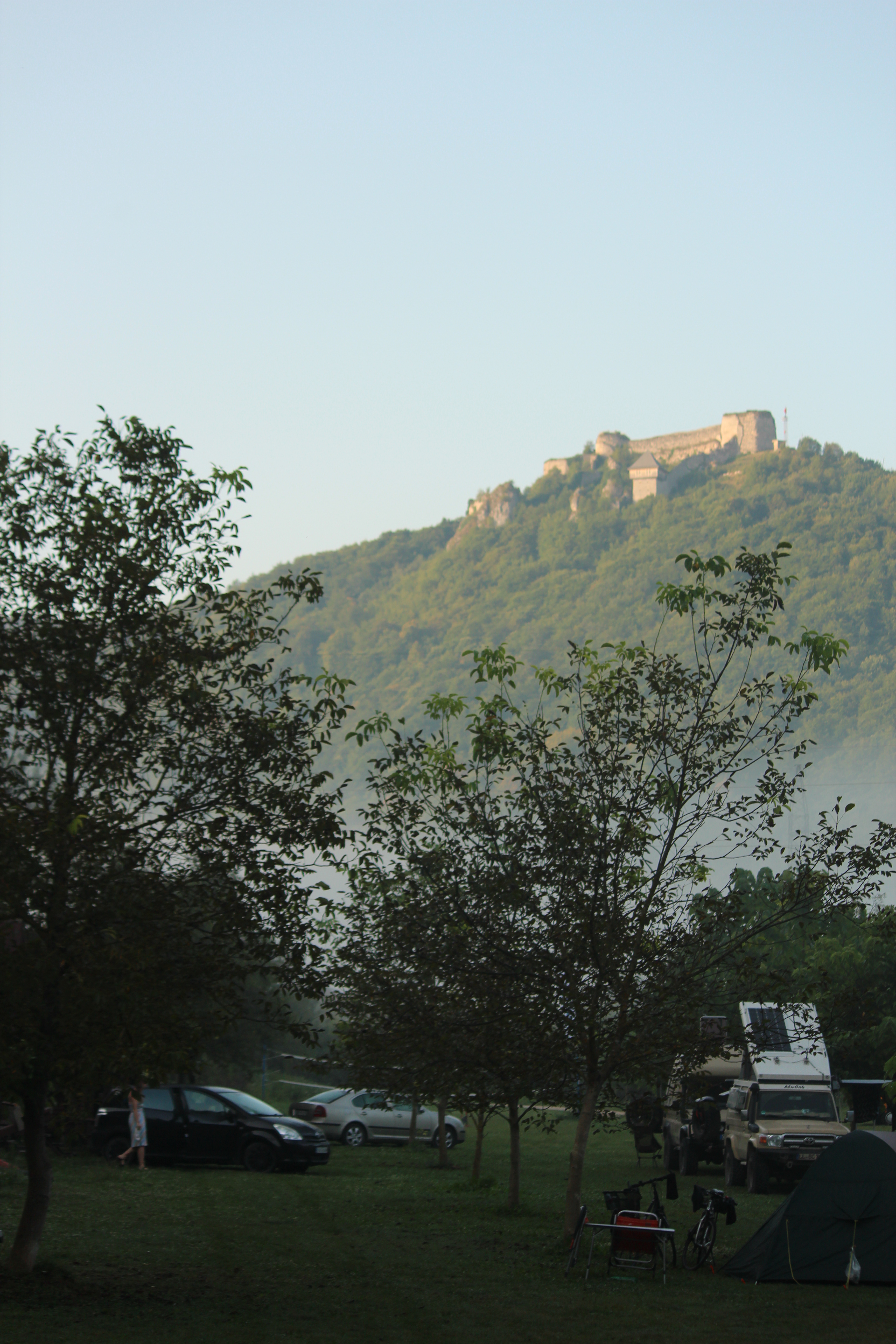 Z powodu ograniczonego czasu na miejscu zdecydowaliśmy się tylko na dwie atrakcje w okolicy. W czwartek rano wybraliśmy się do ruin zamku Ostrovica, na wzgórze, które góruje nad naszym kampingiem i pobliską miejscowością. Pierwszy gród, który powstał w tamtym miejscu, pamiętał czasy imperium rzymskiego, natomiast obecna konstrukcja pochodzi z XV wieku. Mimo że zamek faktycznie jest w stanie rozpadu (widać zewnętrzne ściany, ale w środku nie ma nic, tylko zarośla i delikatnie wydeptane ścieżki), to coś zaczyna się tam dziać. Mianowicie na wschodnim stoku zrekonstruowana została wieża, a przynajmniej jej drewniany elementy. Ale o tym zaraz.