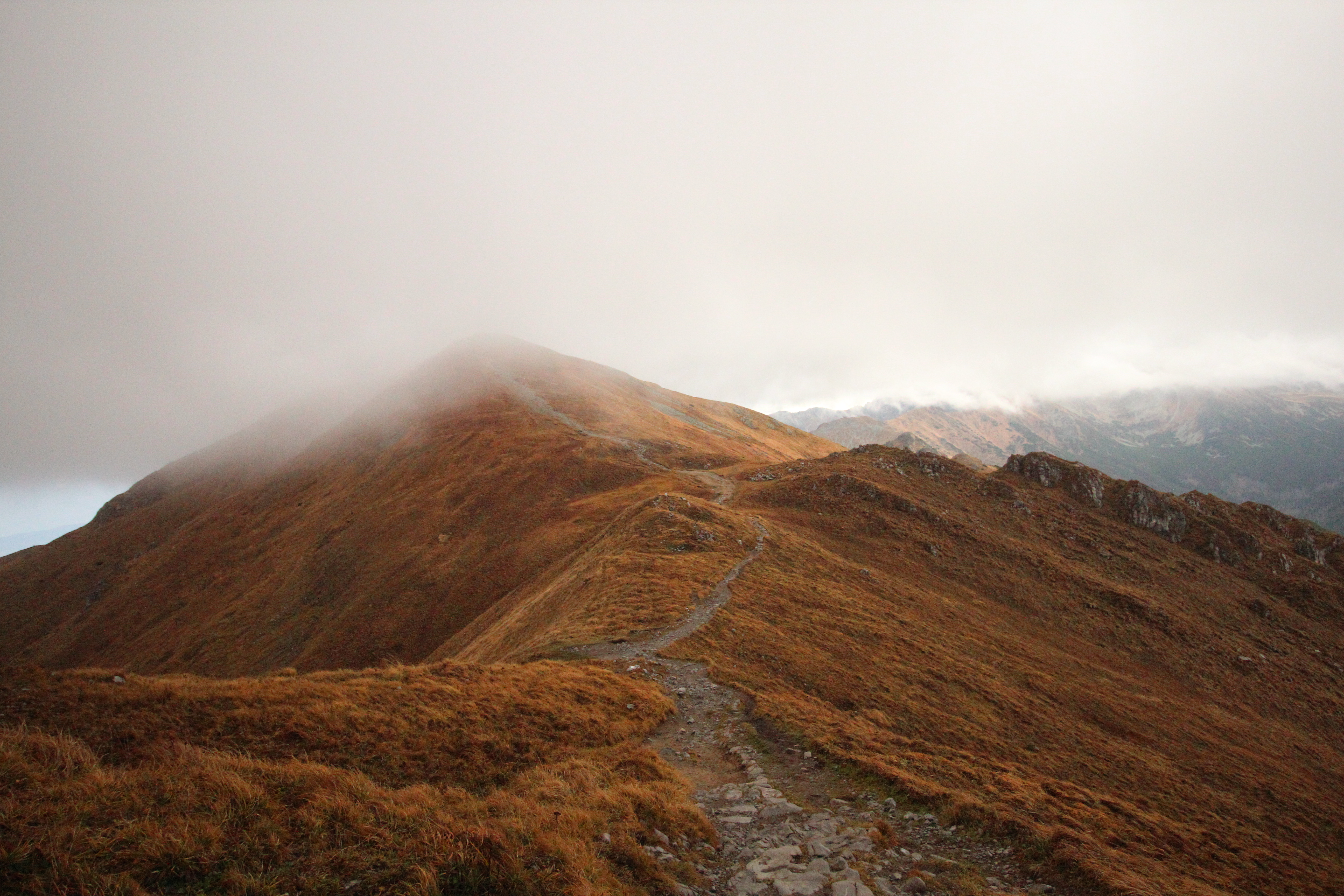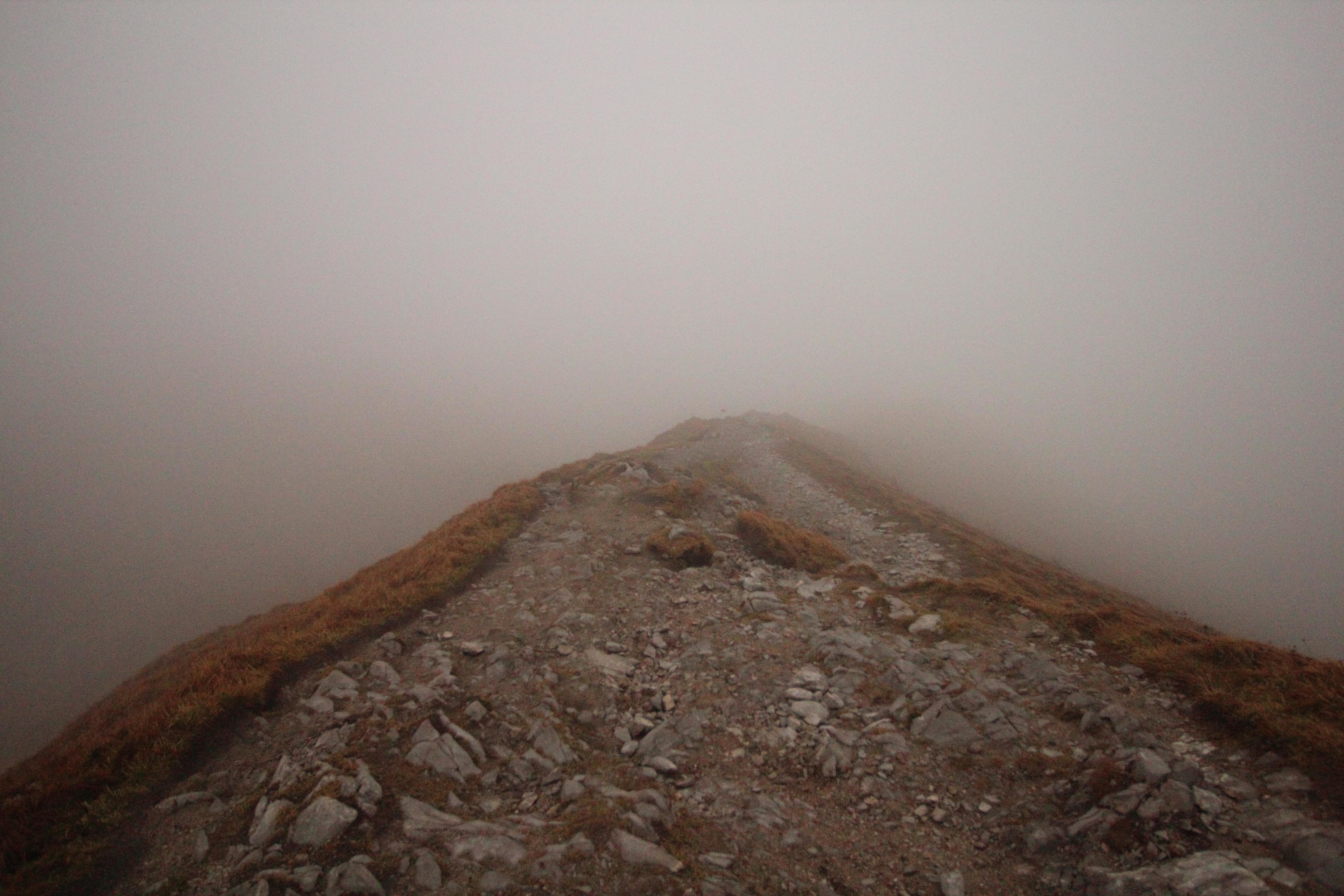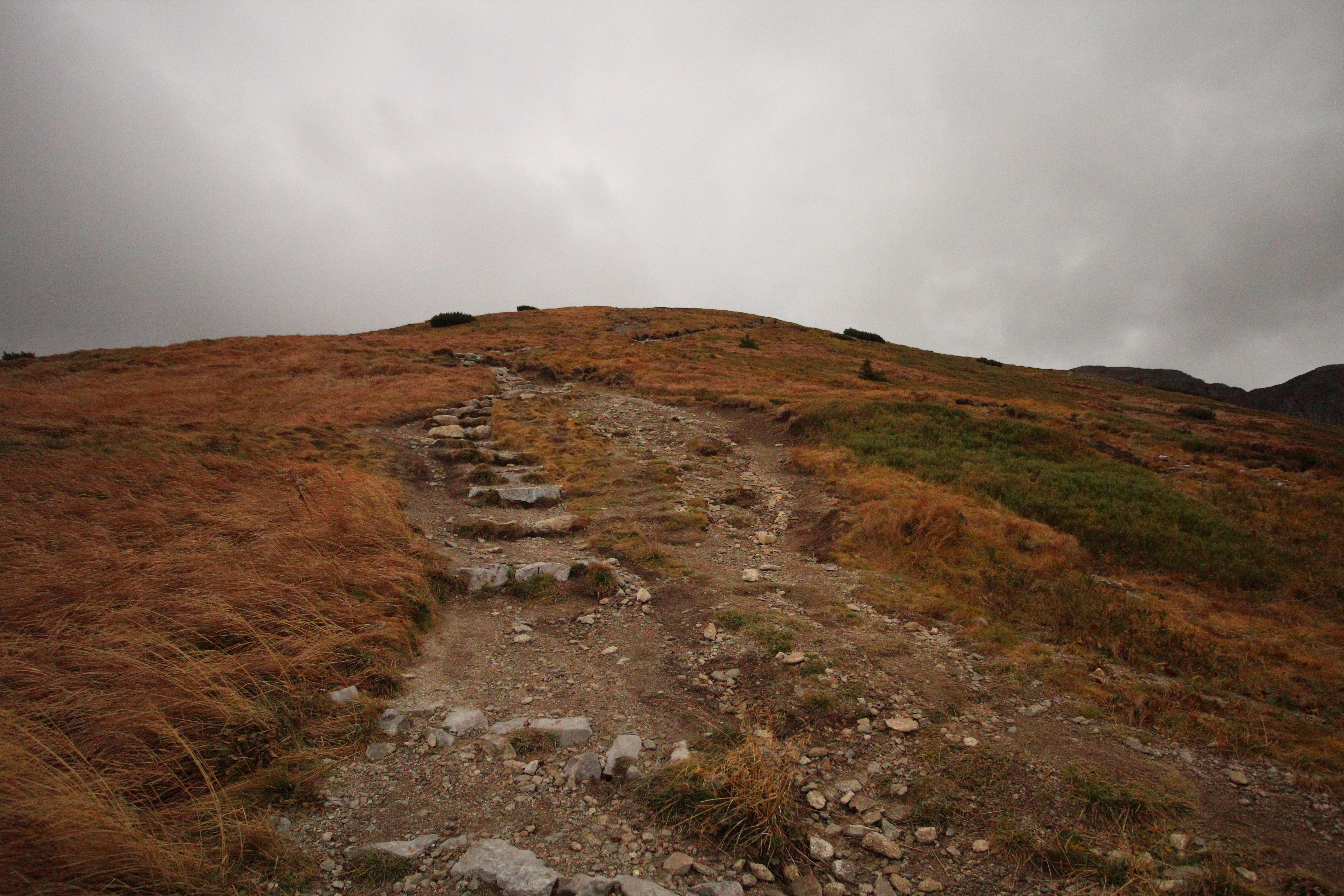 Po przekroczeniu granicy lasu poczułam ulgę psychiczną, ale na pewno nie fizyczną. Dopiero na otwartej przestrzeni halny pokazał, co potrafi. Przy najsilniejszych podmuchach kompletnie nie mogłam zrobić kroku i podejście, które powinno być lekkie, łatwe i przyjemne, zrobiło się dość wymagające. Na dokładkę chmury zasłoniły szczyty, więc pięknych widoków było jak na lekarstwo.
