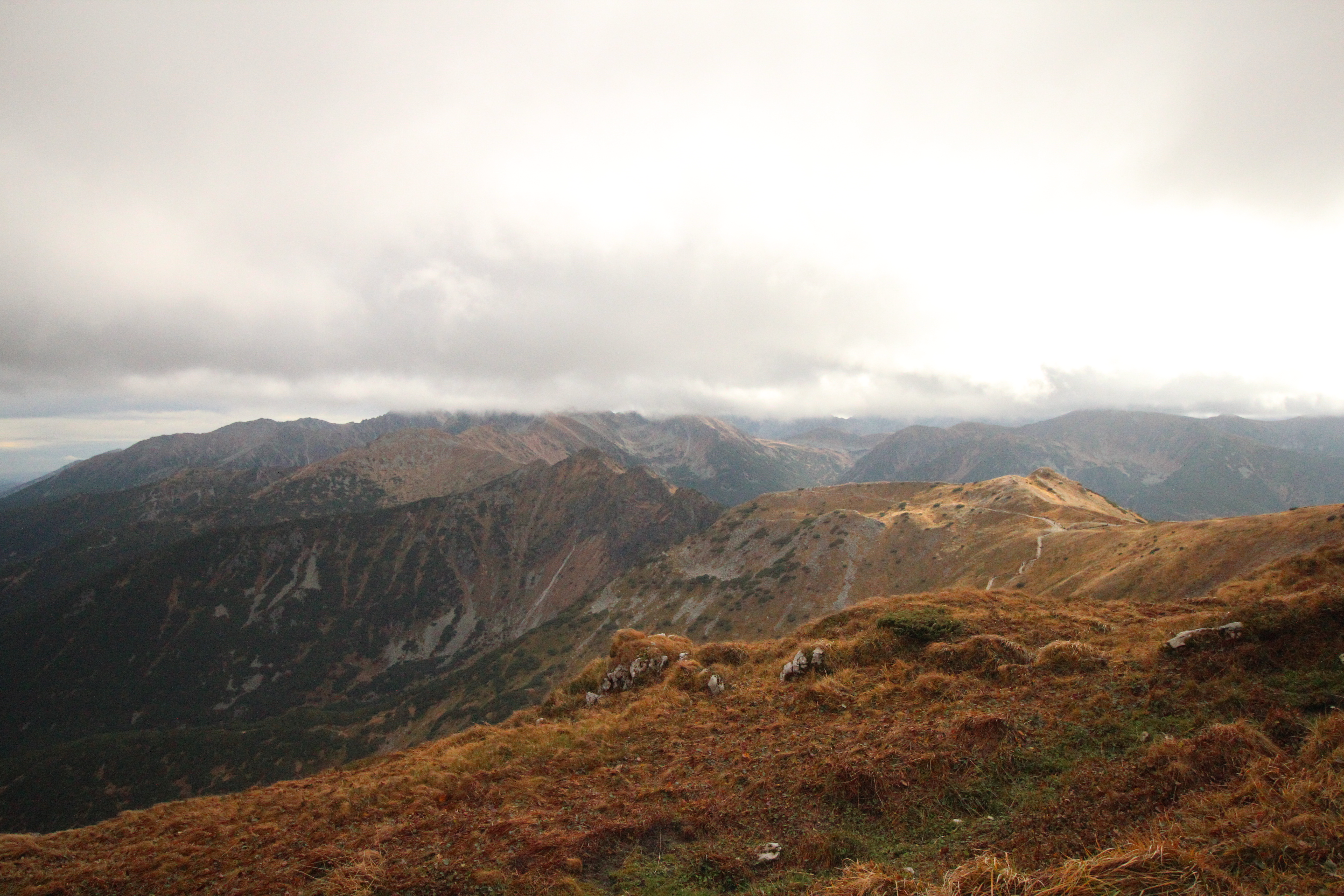Na przełęczy przed Kopą Kondracką wiatr na chwilę przegonił chmury i mogłam przez chwilę podziwiać okolicę, ale dopiero w okolicach Kondrackiej Przełęczy pogoda poprawiła się na tyle, że widać było niemal całą grań Tatr Zachodnich. Myślałam o wejściu na Giewont, ale ostatecznie zagęszczenie turystów w tym kawałku Parku oraz frustracja spowodowana warunkami na podejściu na Czerwony Wierchy sprawiły, że wybrałam zejście do Kuźnic.