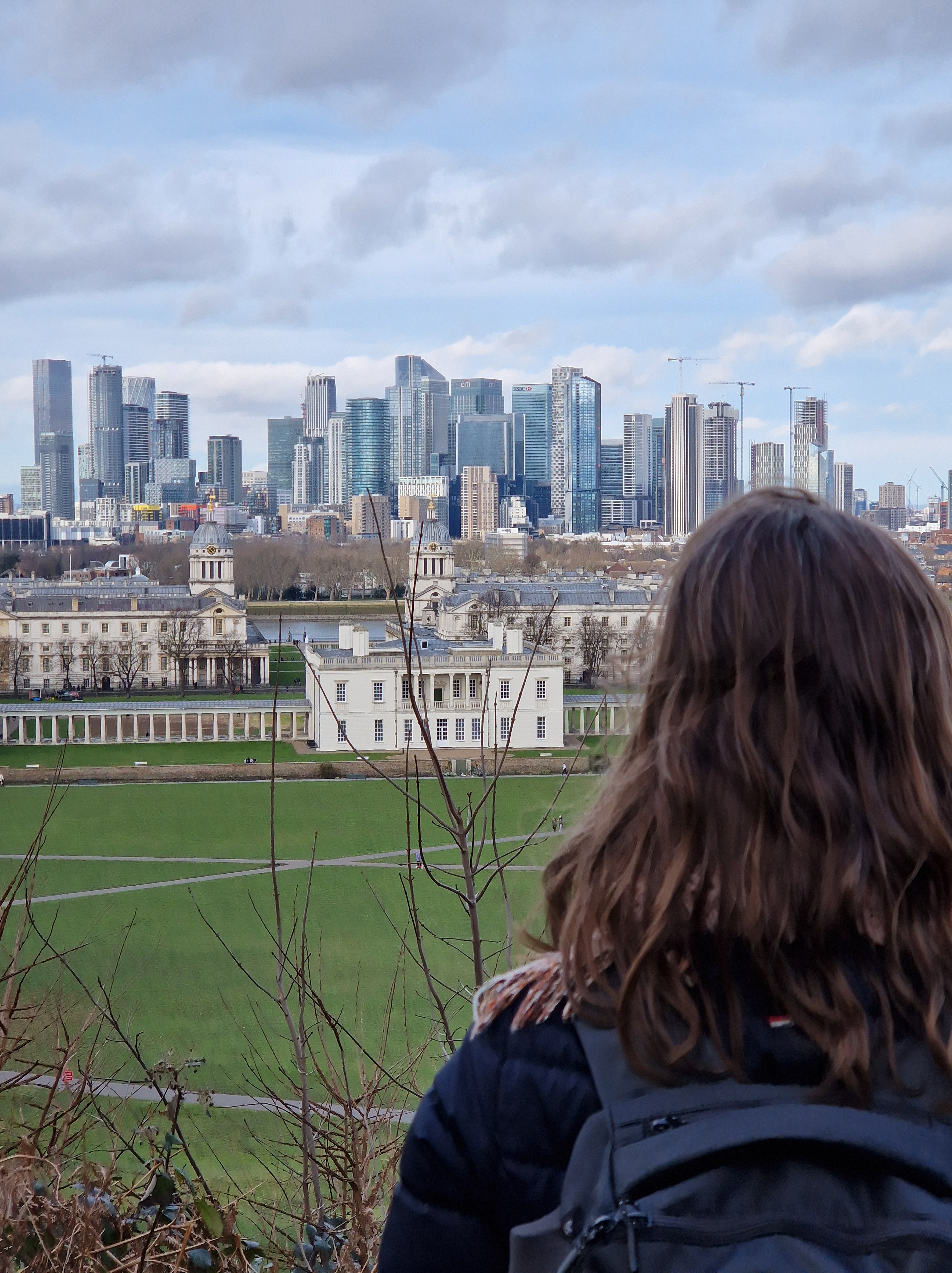 Z północnego zachodu Londynu pojechaliśmy zasadniczo na jego przeciwległy kraniec, bo aż do Greenwich. Przy okazji przesiadki zaliczyliśmy krótki spacer po Canary Wharf, ale naszym głównym celem był park i punkt widokowy przy słynnym obserwatorium astronomicznym. Greenwich zaskoczyło nas nie tylko piękną panoramą miasta (którą podziwialiśmy wśród hałasu remontu dookoła tarasu widokowego), ale także słońcem, które niespodziewanie wyszło na jakiś czas zza chmur. Choć panorama była piękna, to zdecydowanie wolę podziwiać architekturę z bliska. Doceniam jednak samą przestrzeń, bo bardzo przypomina mi Singleton Park w Swansea – a do tego miejsca mam ogromny sentyment.