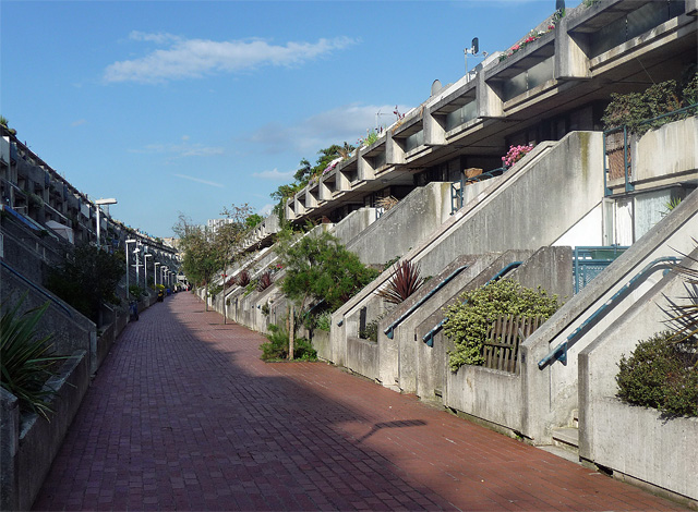 Wczesna godzina lotu (5:50) była raczej zniechęcająca, ale z drugiej strony mieliśmy dzięki temu cały dzień w Londynie bez dodatkowego noclegu. Prosto z Luton pojechaliśmy na Finchley Road i stamtąd spacerem do Alexandra Road Estate, czyli na brutalistyczne osiedle z lat 60. ubiegłego wieku. Są to trzy równoległe bloki, wygięte w łuk, a w dodatku tarasowate (każde kolejne piętro jest cofnięte w stosunku do niższego). Nawet tyle lat po zakończeniu projektu robi on ogromne wrażenie, nie tylko samą formą, ale też ilością zieleni. Owszem, rosną tam pojedyncze drzewa, jest również park na osiedlu, ale nie wyglądałoby to tak imponująco, gdyby nie zieleń wybuchająca z większości balkonów i tarasów. Oczywiście palmy i aloesy zwracają największą uwagę, ale one są tylko uzupełnieniem innych roślin, wśród których nie przeważają kwiaty (odwrotnie niż w Polsce, gdzie zielone, a raczej chaotycznie kolorowe balkony można obserwować ledwie kilka miesięcy w roku). Mam nadzieję, że kiedyś uda mi się przyjechać na to osiedle również latem.