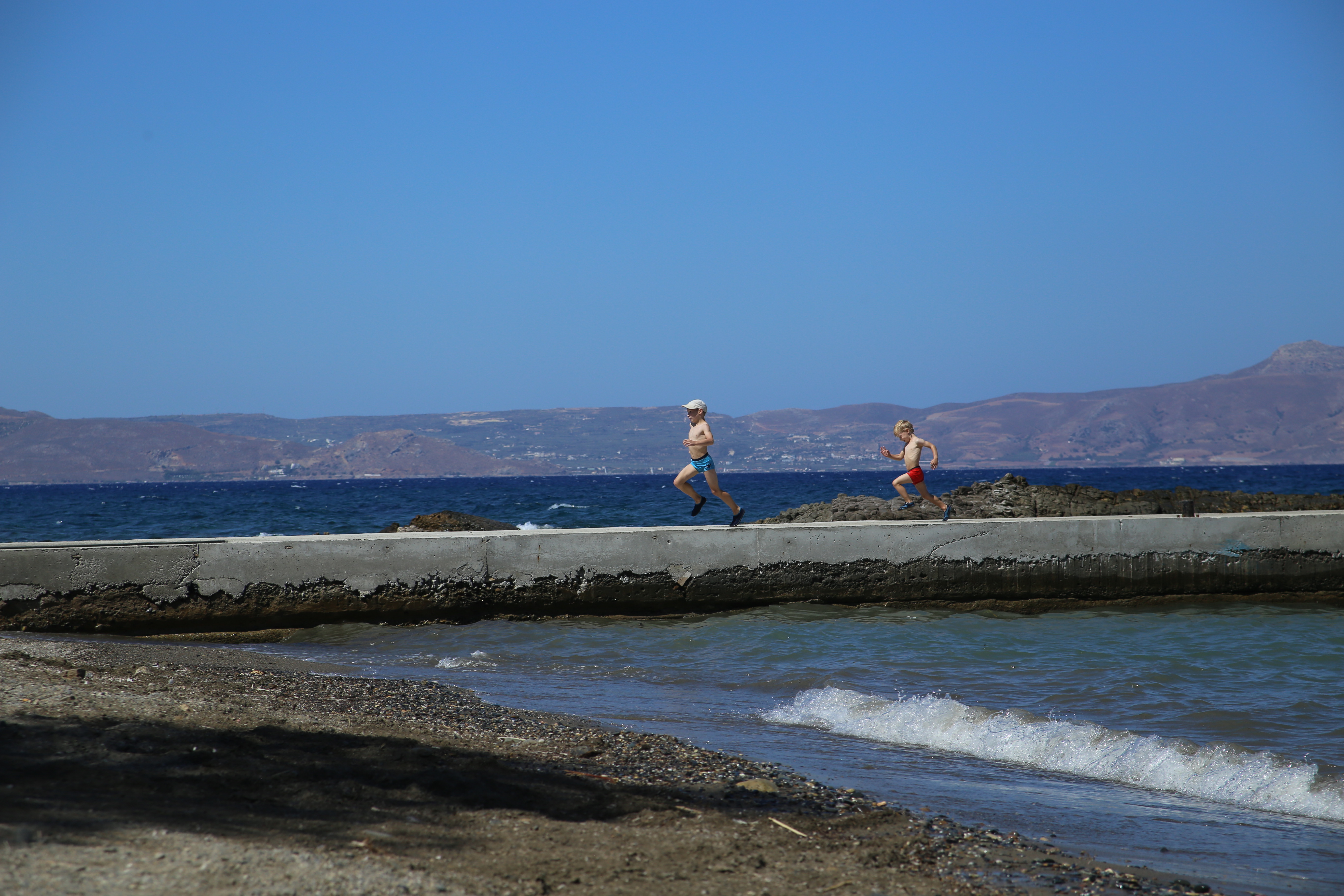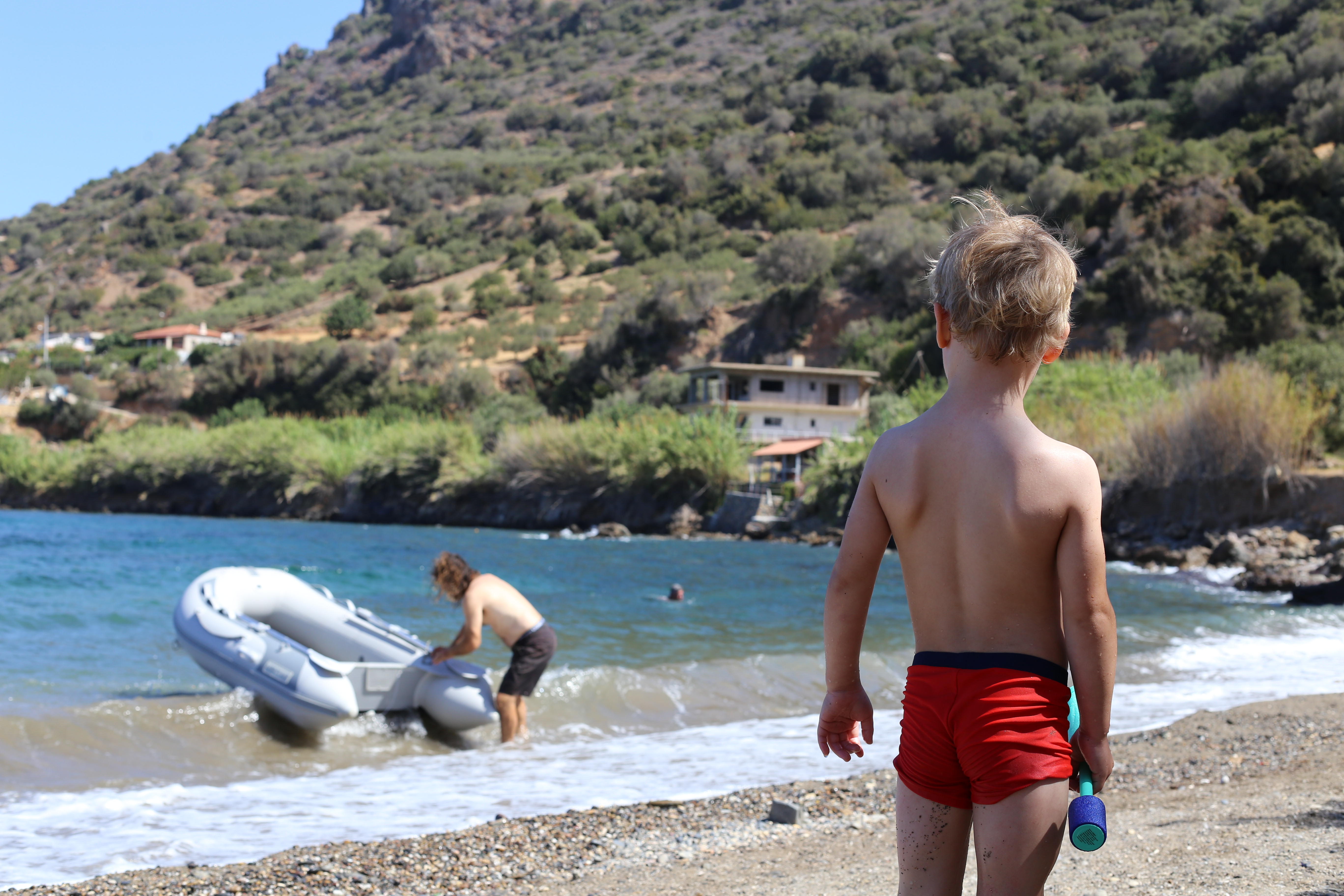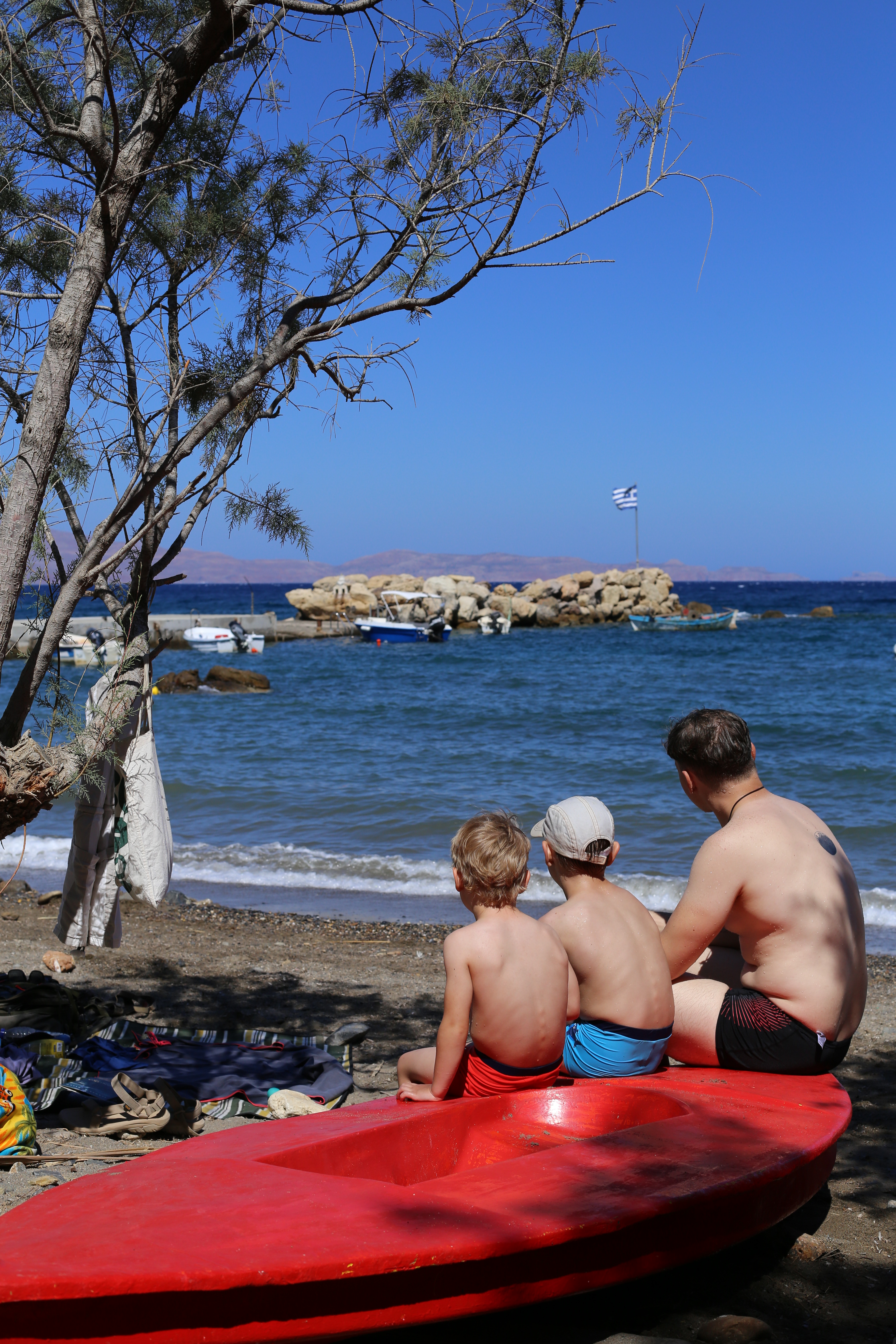 Główna plaża znajduje się na końcu wioseczki (dosłownie, kończy się tam droga), są tam dwie tawerny i wielu turystów, ale domek, który zajmowaliśmy jest dużo bliżej małej plaży położonej przy molo (jest nieoznaczona na Google maps, znajduje się między Villa Angela a Traditional House KYMA). Plaża jest piaszczysto-kamienista, ale przez większość dnia zupełnie pusta (nie licząc jej stałych mieszkanek – gęsi i kaczki). Zacumowane są tam też łódki lokalsów, którzy czasem przychodzą łowić ryby.
