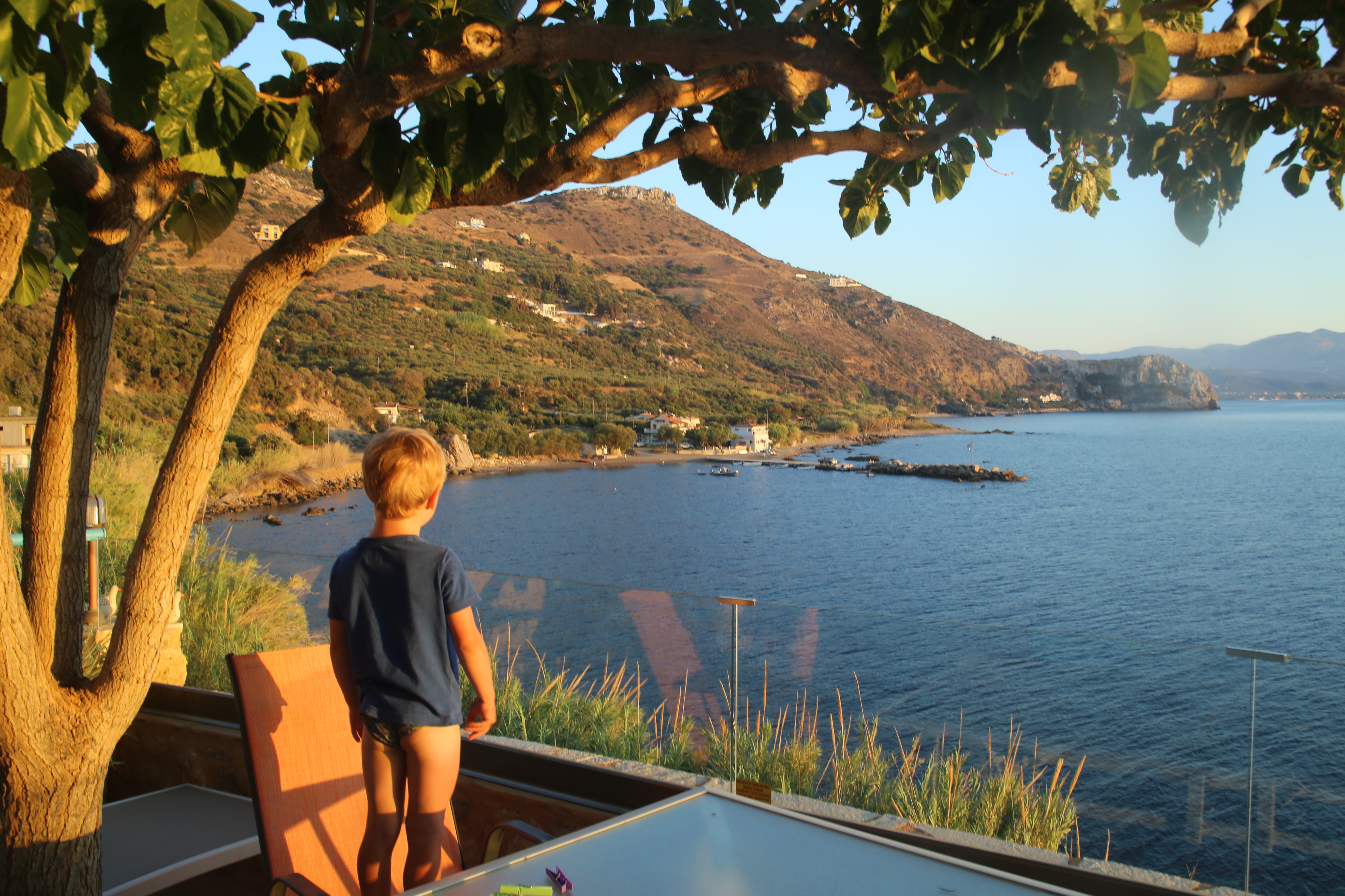 Owszem, wystrój jest tak nieudany jak na zdjęciach, ale widok z domku, szczególnie sprzed wejścia i z tarasu od strony zachodniej zapiera dech w piersiach. Ogromne okna w salonie można niemal całkowicie rozsunąć i podziwiać zatokę również ze środka. Na tarasie rosną dwa okazałe drzewa, dające sporo cienia (te drzewa są również skolonizowane przez cykady, które wrzeszczą przeraźliwie, ale zamykają się tuż przed zachodem słońca), rozstawione są wygodne leżaki i krzesła, a wieczorem wzgórze, na którym położona jest Ravdoucha jest delikatnie tylko oświetlone nielicznymi latarniami i światłami budynków. Kissamos, najbliższe duże miasto leży niemal na wprost od tarasu, ale na dzieli je od domku zatoka, więc światła portowe absolutnie nie zakłócają obserwacji gwiazd (12 sierpnia mogliśmy podziwiać Perseidy).