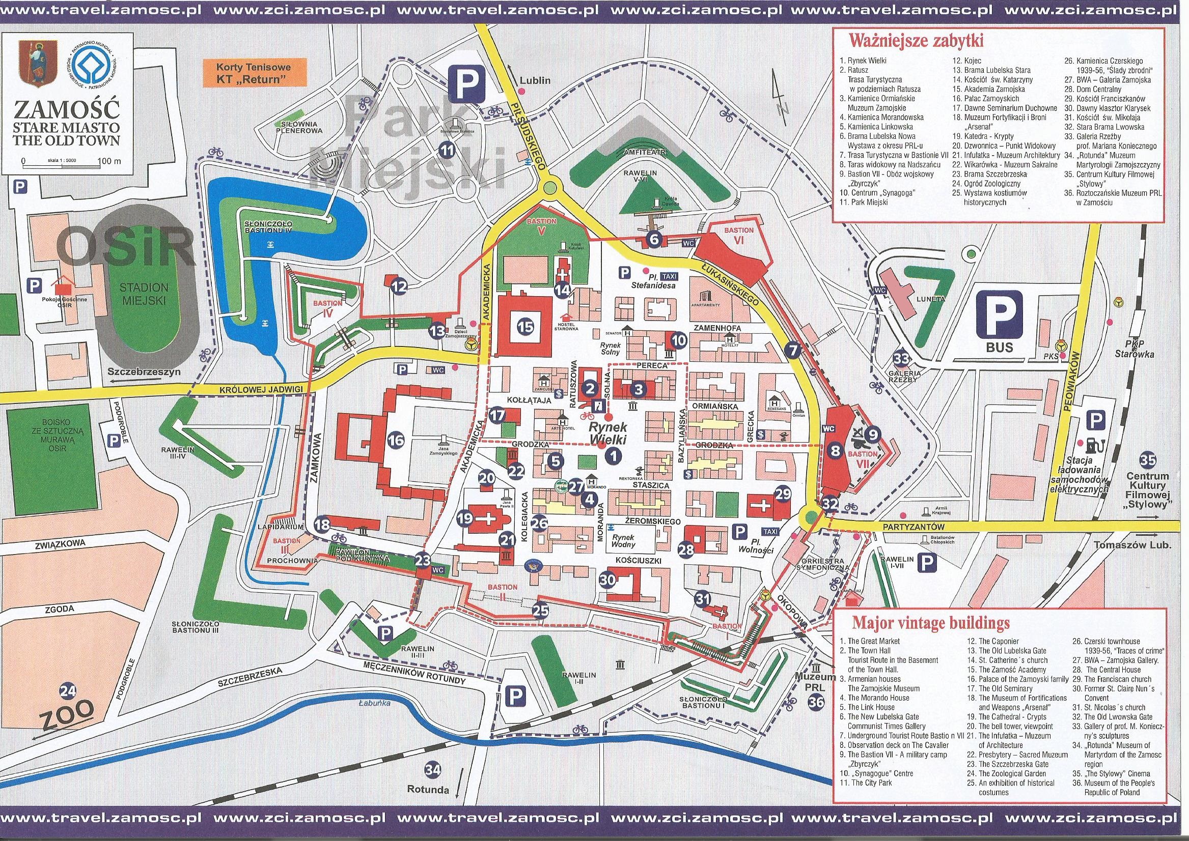 3 maja opuściliśmy już Roztoczański Park Narodowy i udaliśmy się do Zamościa. Jest to miasto o bardzo ciekawej historii i świetnie przemyślanej urbanistyce, i wiedzieliśmy, że jest idealne na kilkugodzinny spacer. Zaczęliśmy oczywiście od punktu informacji turystycznej, skąd wzięliśmy mapę, niemal dokładnie taką jak ta: