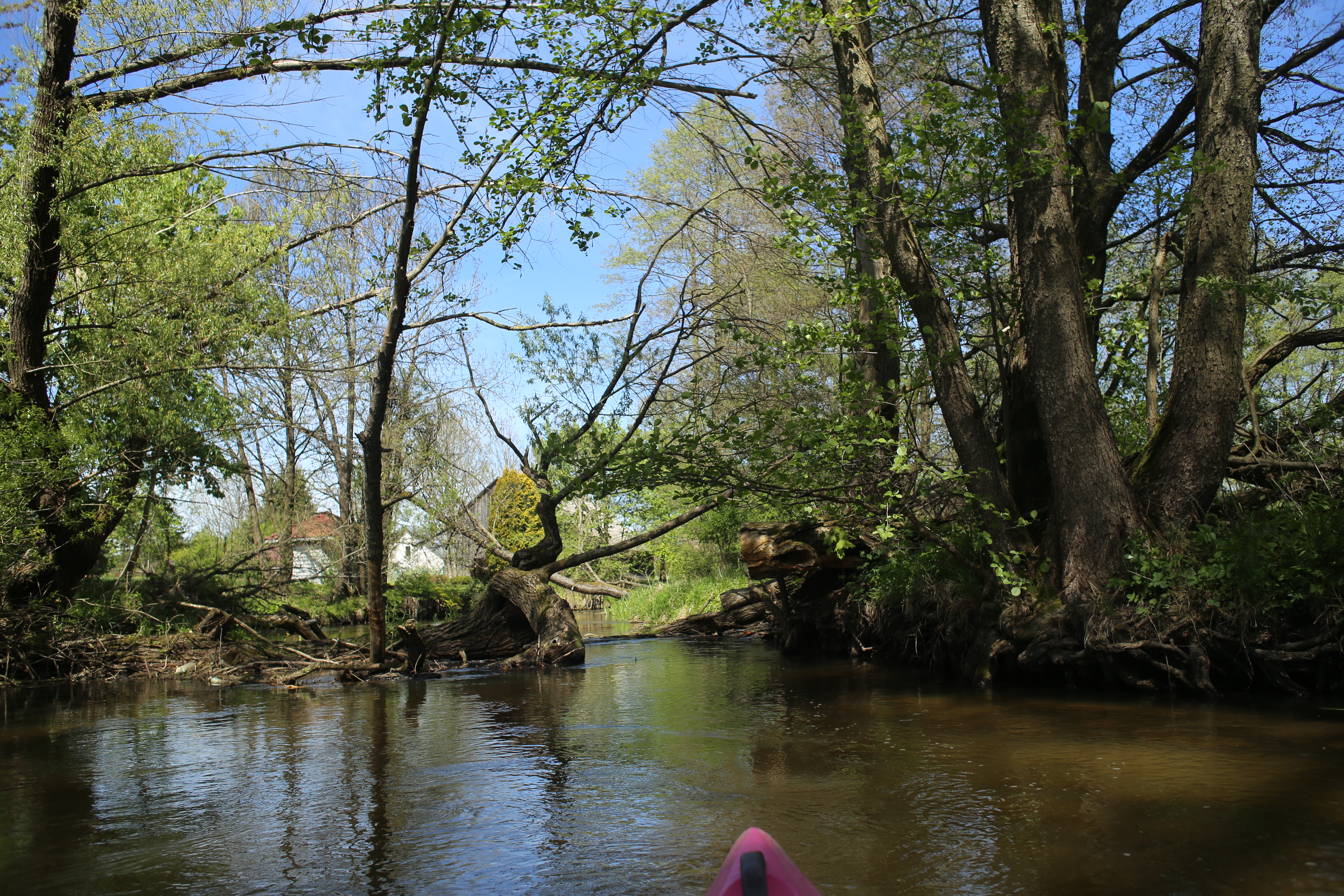 Na pomoście na prawym brzegu rzeki było całkiem spokojnie – przed nami wypłynęły w dalszą drogę dwa kajaki. Ale w momencie, kiedy my przygotowywaliśmy się do dalszego startu, na lewym brzegu desantowała się grupa w sześciu czy siedmiu kajakach. I już po kilku minutach zrozumieliśmy dlaczego. Etap II spływu (zalew Rudka – most Bagno) jest chyba najbardziej malowniczy ze wszystkich. Choć jest odrobinę mniej kręty niż etap I czy V, to manewrów jest tam sporo ze względu na powalone drzewa. Kilkukrotnie przepływaliśmy przez miejsca o szerokości jednego kajaka (z ledwie kilkucentymetrowym luzem), niejednokrotnie musieliśmy się nachylać, żeby gdzieś się zmieścić, a raz musieliśmy się dosłownie położyć w kajaku, żeby zmieścić się pod drzewem.