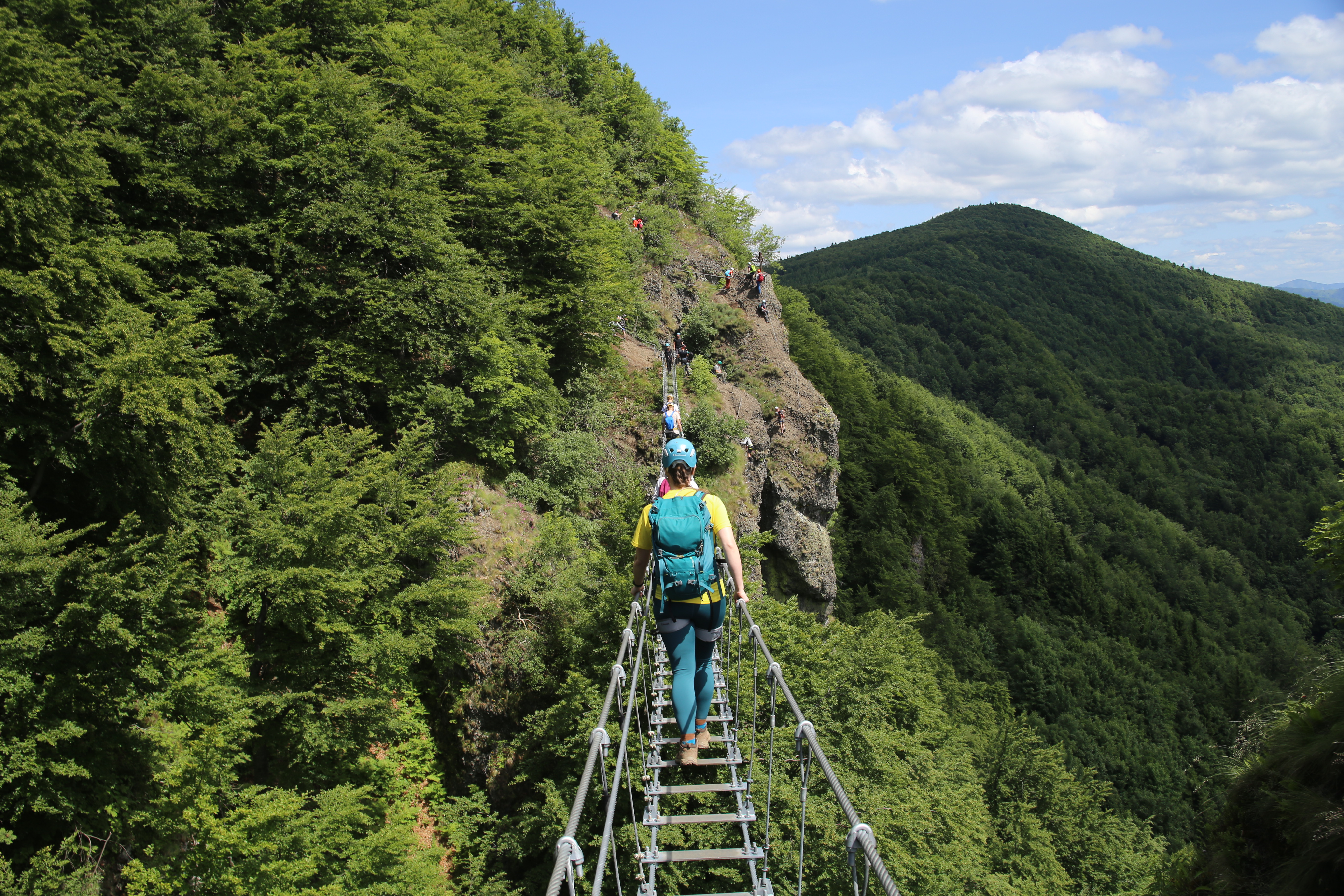Jeszcze tego samego dnia zaplanowaliśmy powrót do Warszawy, więc od początku wiedzieliśmy, że zdecydujemy się na jeden obszar i ze względu na to, że byliśmy na ferratach pierwszy raz, wybraliśmy Ferraty Komin. Przeszliśmy cztery drogi od A do D: Most, Jánošíkova diera, Zastupovka i Lanová sieť. Most jest wyceniany na A, bo pod względem technicznym to faktycznie poziom trudności 0. Lonżę wpiąć trzeba raz, na początku drogi, i wypiąć na końcu. Po drodze nie ma żadnych przepinek, więc można przez cały czas trzymać się poręczy. A warto, bo buja dość mocno. I widziałam, że dla wielu osób właśnie to przejście po mostku, które wygląda niepozornie, było dużym wyzwaniem. Widoki z mostu są fantastyczne i trochę umilają przejście nad przepaścią, ale czuć trochę adrenaliny.