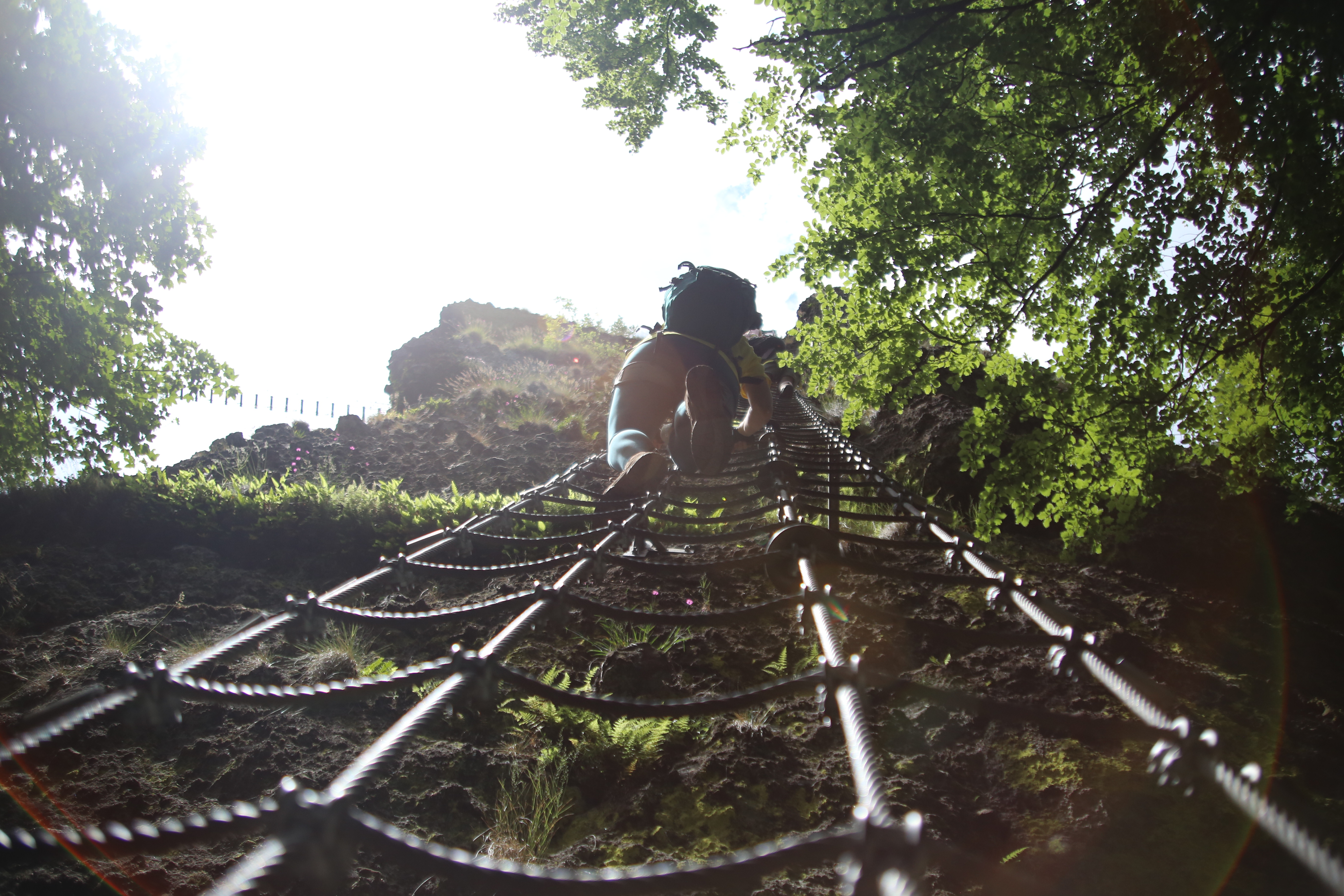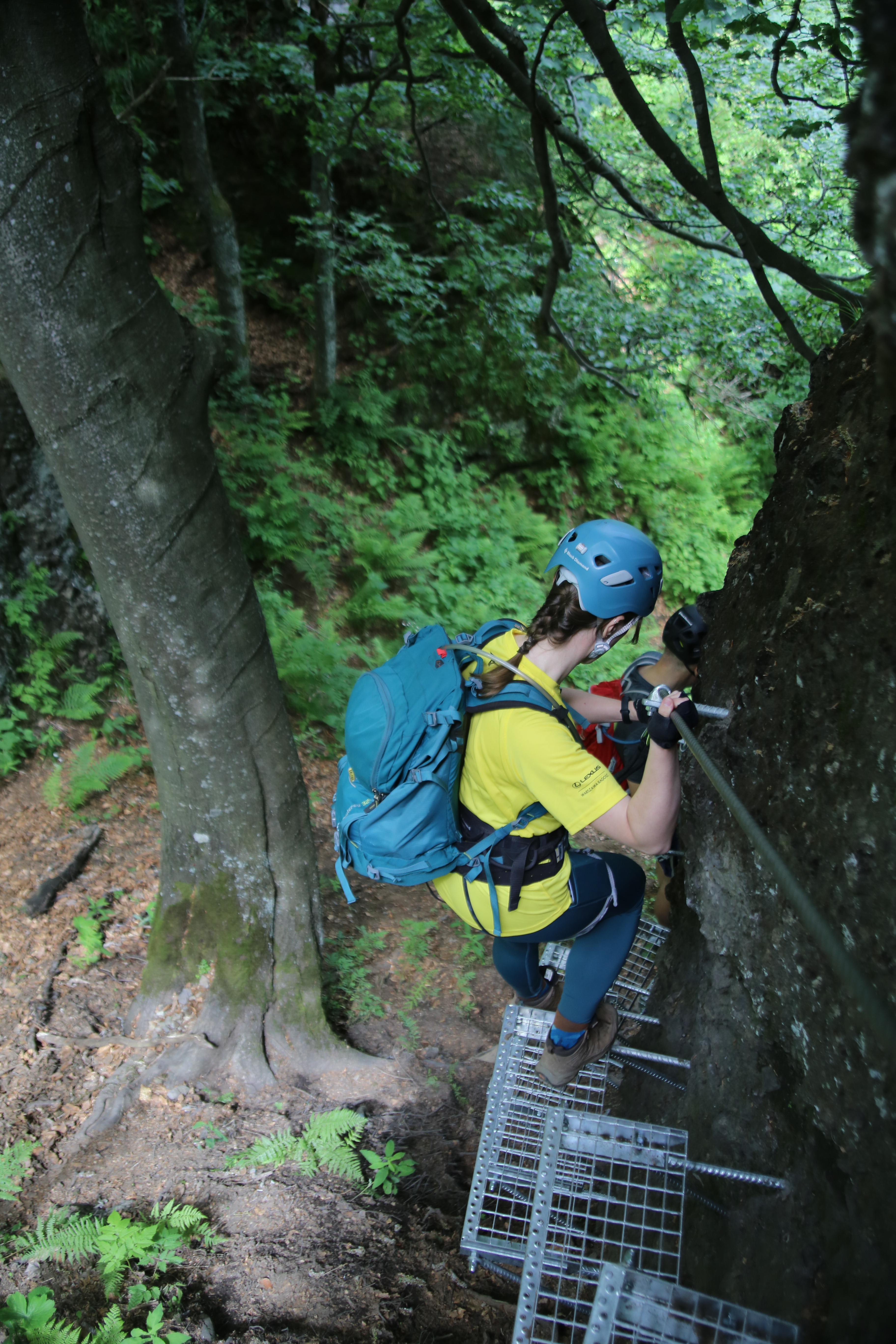 Jánošíkova diera to króciutka droga ubezpieczona klamrami, ale z bardzo wygodnymi naturalnymi chwytami; można tutaj w poćwiczyć przepinanie, podobnie jak na Zastupovce, która jest z kolei dłuższa i na pewno bardziej malownicza (schodzi w dół małego wąwozu i prowadzi obok pięknego, 200-letniego jawora). Ostatnią drogą, którą przeszliśmy w Skałce była Lanová sieť i akurat ta ferrata jest nie tyle trudna, co bardzo męcząca. Sieć jest dość gęsta, przepięcia wypadają tak naprawdę co długość ramion (chyba że ktoś ma długą lonżę i chce kucać na tej siatce…). W dodatku tutaj również mocno buja, przez co mięśnie ramion i przedramion są ciągle napięte. Po dojściu na górę czułam, że nie dam rady wejść już nigdzie, bo moje ręce są po prostu zużyte.