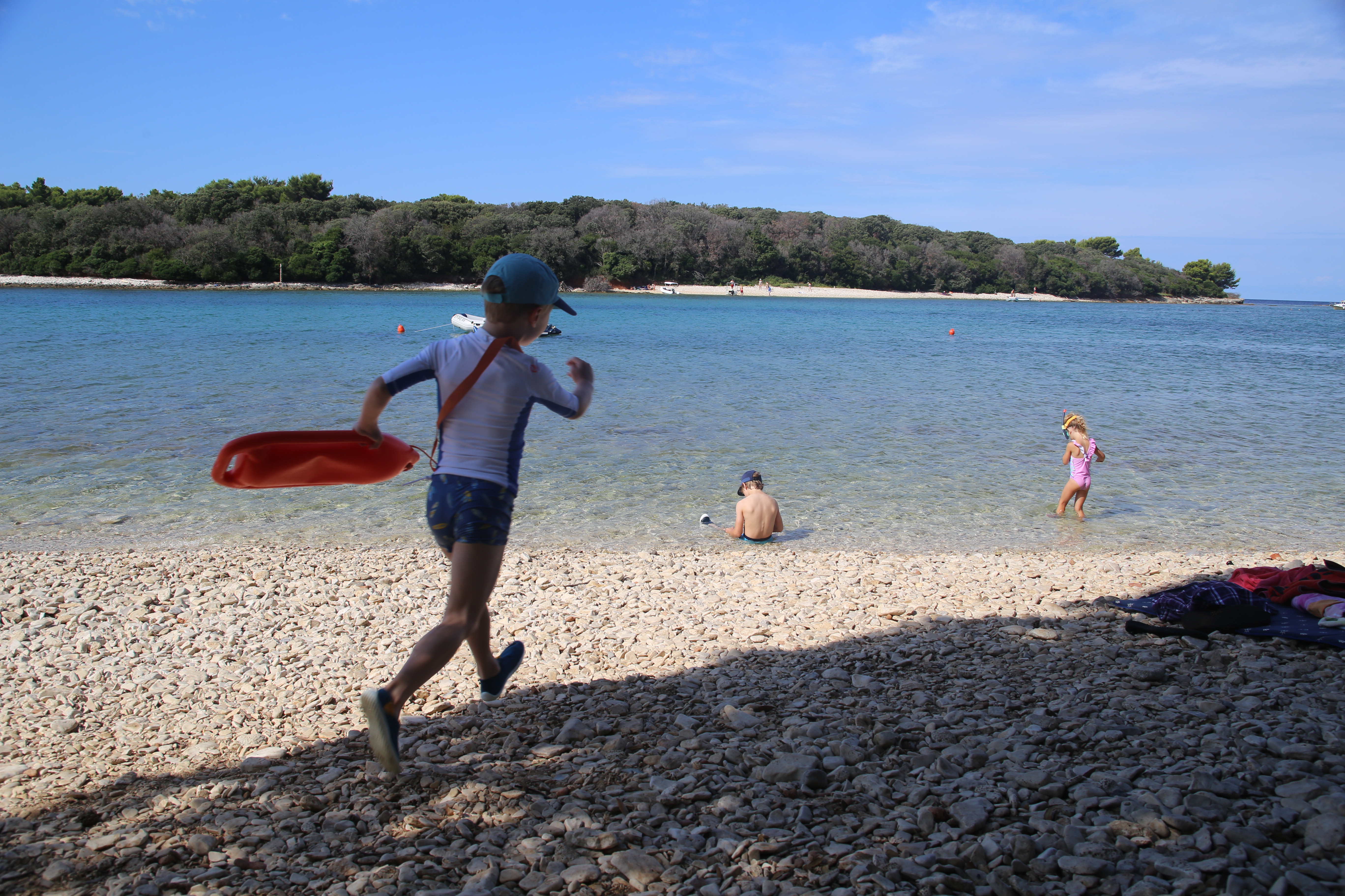Akurat w Banjole znalazłam taką nieskomplikowaną miejscówkę; podobnie jak poprzednio, z domkami holenderskimi, a dodatkową atrakcją na plaży była bliskość trzech wysp: Otočić Frašker, Otočić Fraškerić i Veruda. Jak słusznie podejrzewaliśmy, stanowiły one doskonały cel wycieczek na SUPach czy kajakach, za to Marcin pływał tam kilka razy dziennie wpław (oczywiście z bojką, wspomagał się też płetwami). To, czego nie wiedziałam o tej uroczej zatoczce, to ilość przepływających tamtędy i cumujących tam łódek i żaglówek. I to naprawdę blisko. Od razu po wejściu na plażę zrozumiałam, że jest tam po prostu głośno, dużo głośniej niż było w Baškiej Vodzie. Po kilku dniach przyzwyczaiłam się do tego, ale w pierwszym momencie doznałam lekkiego szoku.