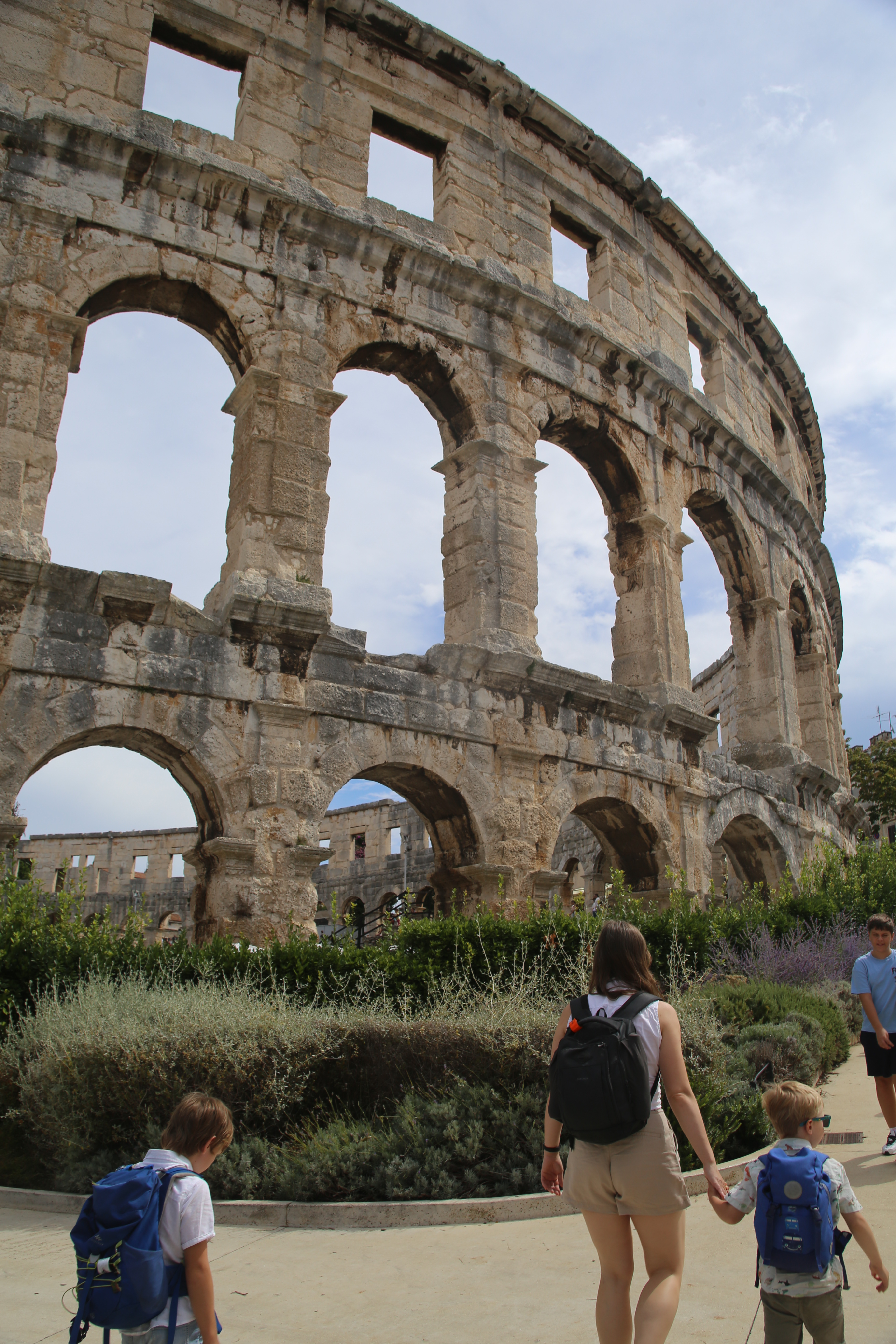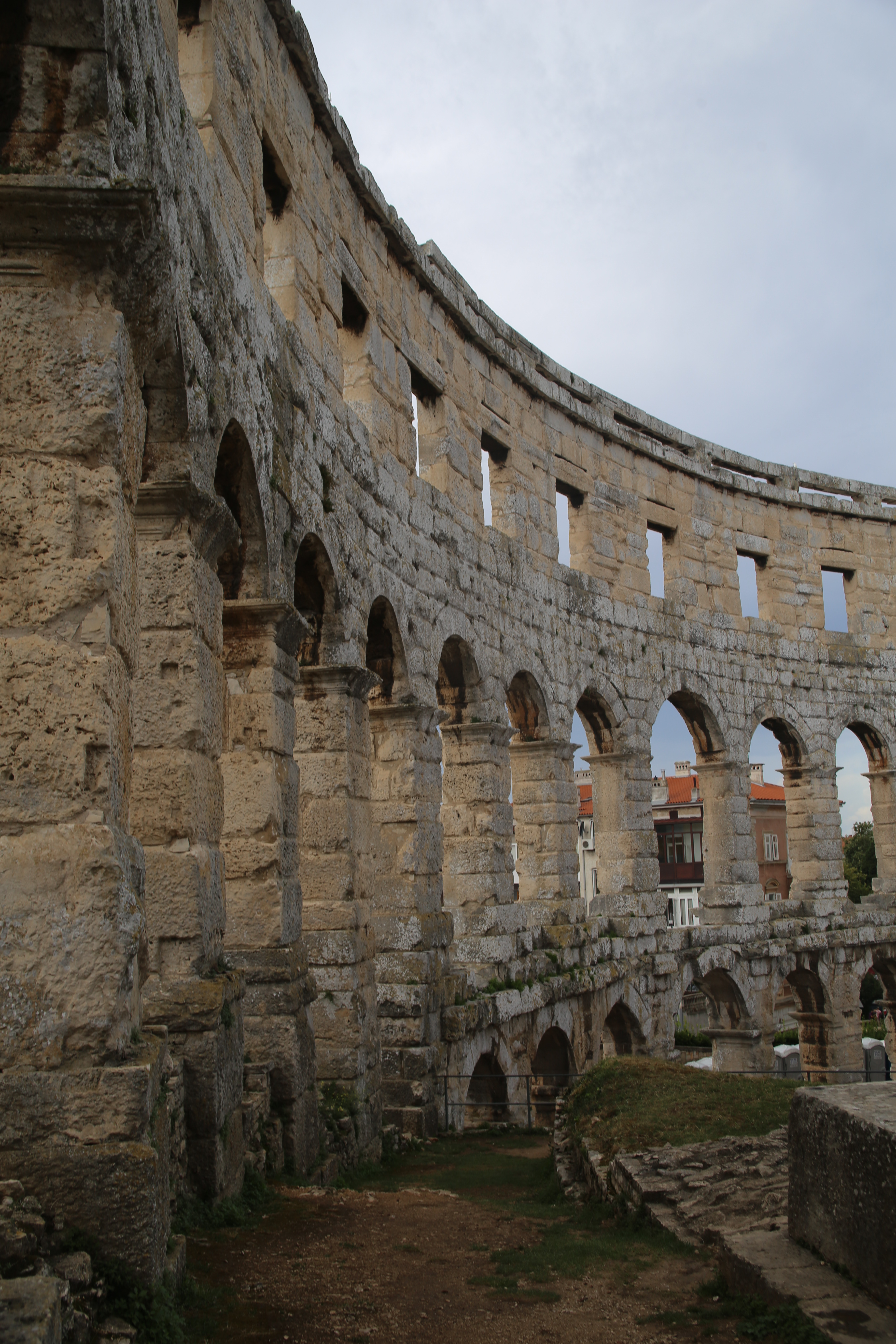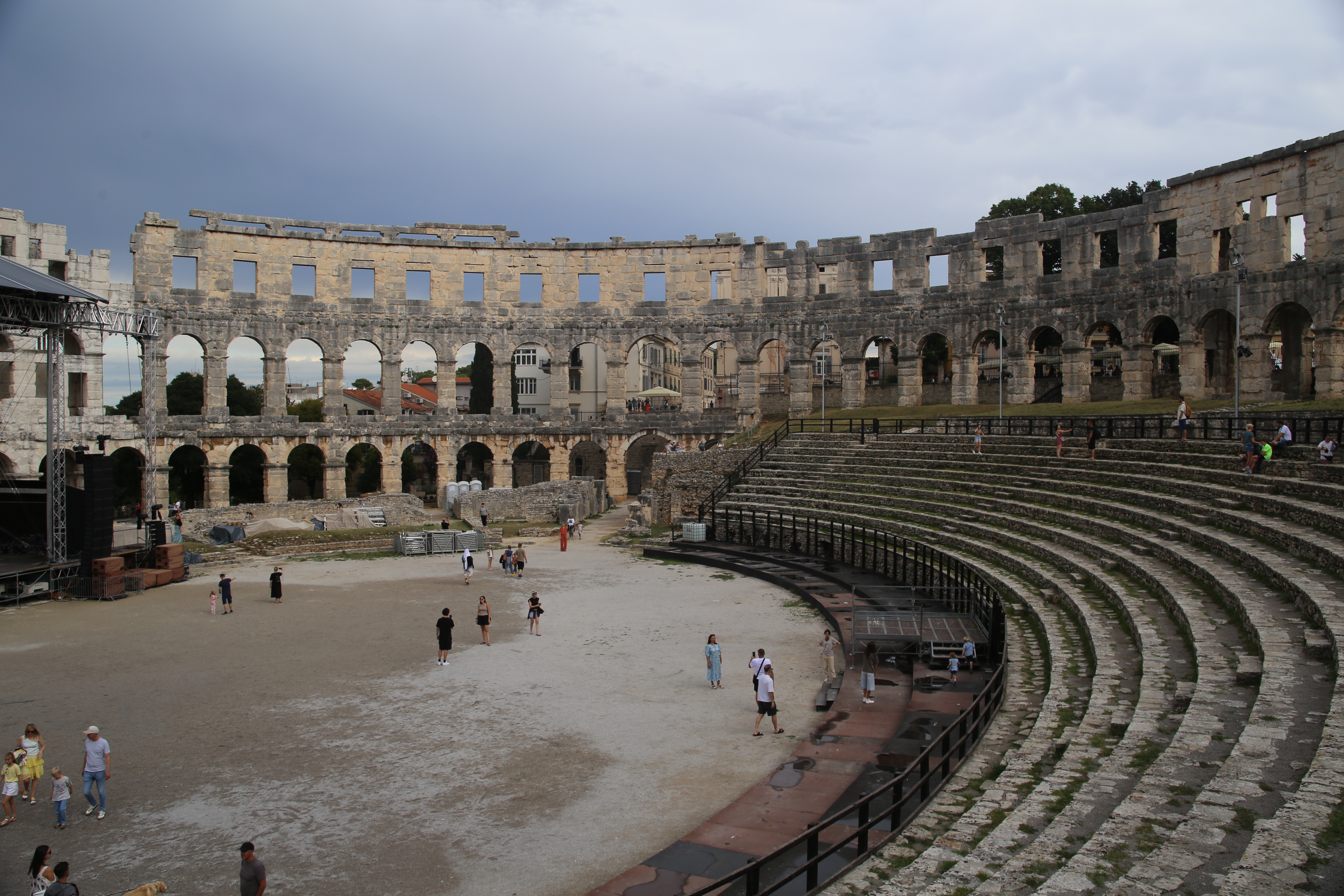 Atrakcją numer 1 w Puli jest zdecydowanie amfiteatr. Nie ma się co dziwić – budowla ma ponad 2000 lat, a jest w tak doskonałym stanie, jak rzymskie Koloseum. Do dziś służy jako scena koncertowa i choć obecnie oferuje jedynie 5 tysięcy miejsc siedzących, dawniej mieściła… 23 tysiące widzów! Amfiteatr był również źródłem kamienia dla lokalsów, zbudowano z niego np. dzwonnicę przy miejscowej katedrze, ale szczęśliwie rozbiórek ostatecznie zabroniono i dziś wciąż możemy podziwiać ten niesamowity obiekt. Jednak moim zdaniem w zupełności wystarczy obejrzenie go z zewnątrz, np. z ulicy Ozad Arene, dokładnie z tyłu budynku (patrząc od wejścia) – tak się składa, że ta ulica jest odrobinę wyżej niż najwyższe siedzenia na widowni, a łuki amfiteatru oddziela od ulicy jedynie krata. Ba, tuż obok niej są ogródki kilku knajpek, więc wnętrze amfiteatru możecie podziwiać z kawą czy innym trunkiem w ręku. Bilet wstępu daje tylko taki bonus, że można zajrzeć również do podziemi, ale uważam, że maleńka wystawa poświęcona starożytnym funkcjom piwnic amfiteatru oraz historii oliwy z oliwek w regionie nie jest warta ceny wstępu (10/5 euro).