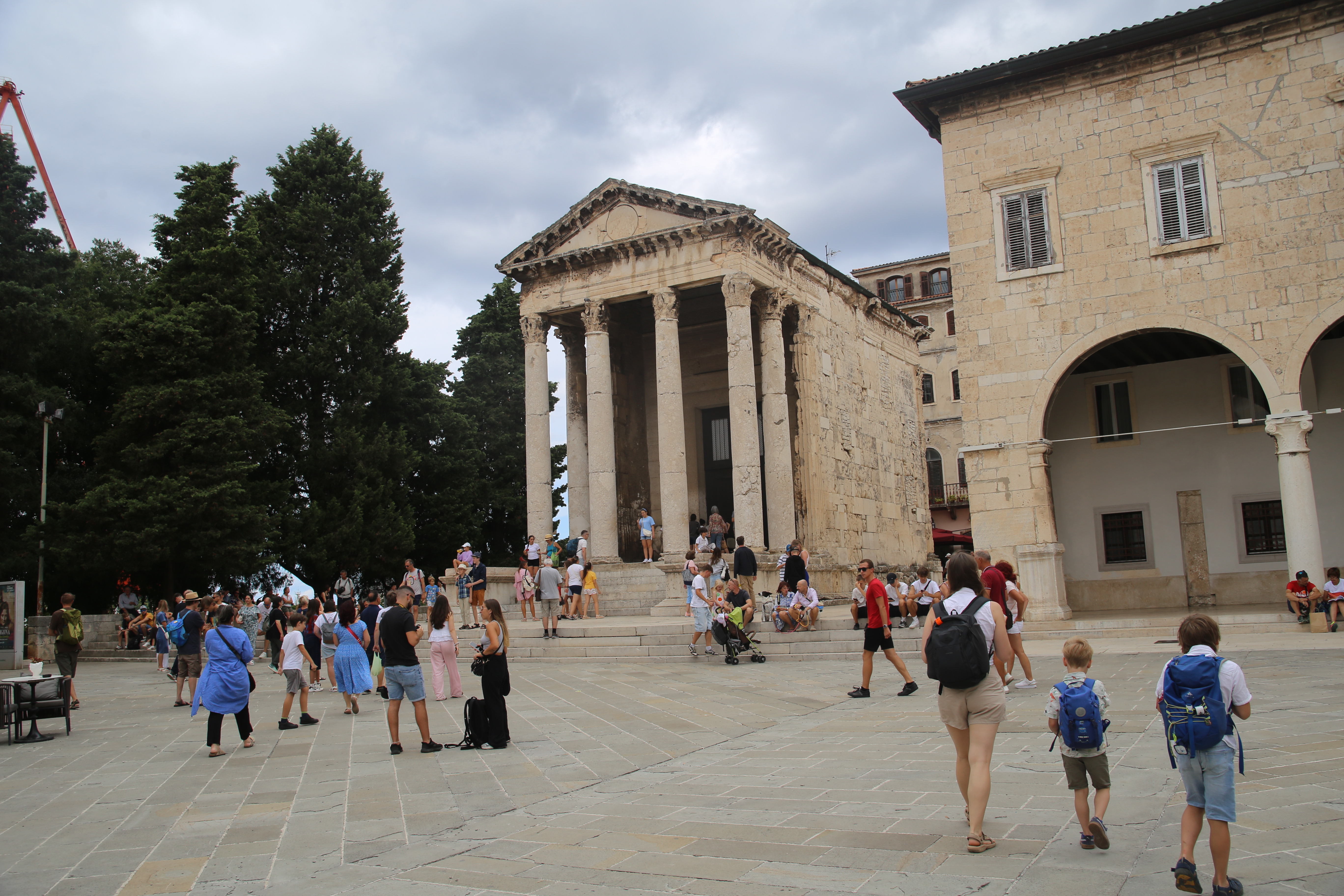 Po obejściu każdego dostępnego zakamarka pierwszej atrakcji (zajęło nam to mniej niż pół godziny), skierowaliśmy się w stronę Forum, po drodze zahaczając o kościół św. Antoniego z pierwszej połowy XX wieku. Nie uniknęliśmy również przejścia pod słynnym Łukiem Sergiusza (polecam zatrzymanie się POD nim i przyjrzenie się stropowi – moim zdaniem to jeden z ciekawszych elementów łuku). Wreszcie ulicą (również) Sergiusza (miejscowe Krupówki; jeśli nie szukacie tłumów, pamiątek lub lodów, spróbujcie użyć bocznych uliczek) dotarliśmy do Forum. Takiego Forum, jakie znacie z książek do historii – starożytnego rynku, który kiedyś stanowił serce miasta, a powstał niewiele później niż amfiteatr. Do dziś przetrwała tam świątynia Augusta (z przełomu 1 wieku przed i naszej ery) oraz ściana bliźniaczej świątyni Diany. Owa ściana została wykorzystana do budowy ratusza, który teraz jest ciekawą hybrydą – ogólnie jest budynkiem gotyckim (XIII wiek), który został przebudowany w stylu renesansowym (XV wiek), a potem barokowym (XVII wiek), natomiast jego tył reprezentuje starożytność (początek I wieku naszej ery).