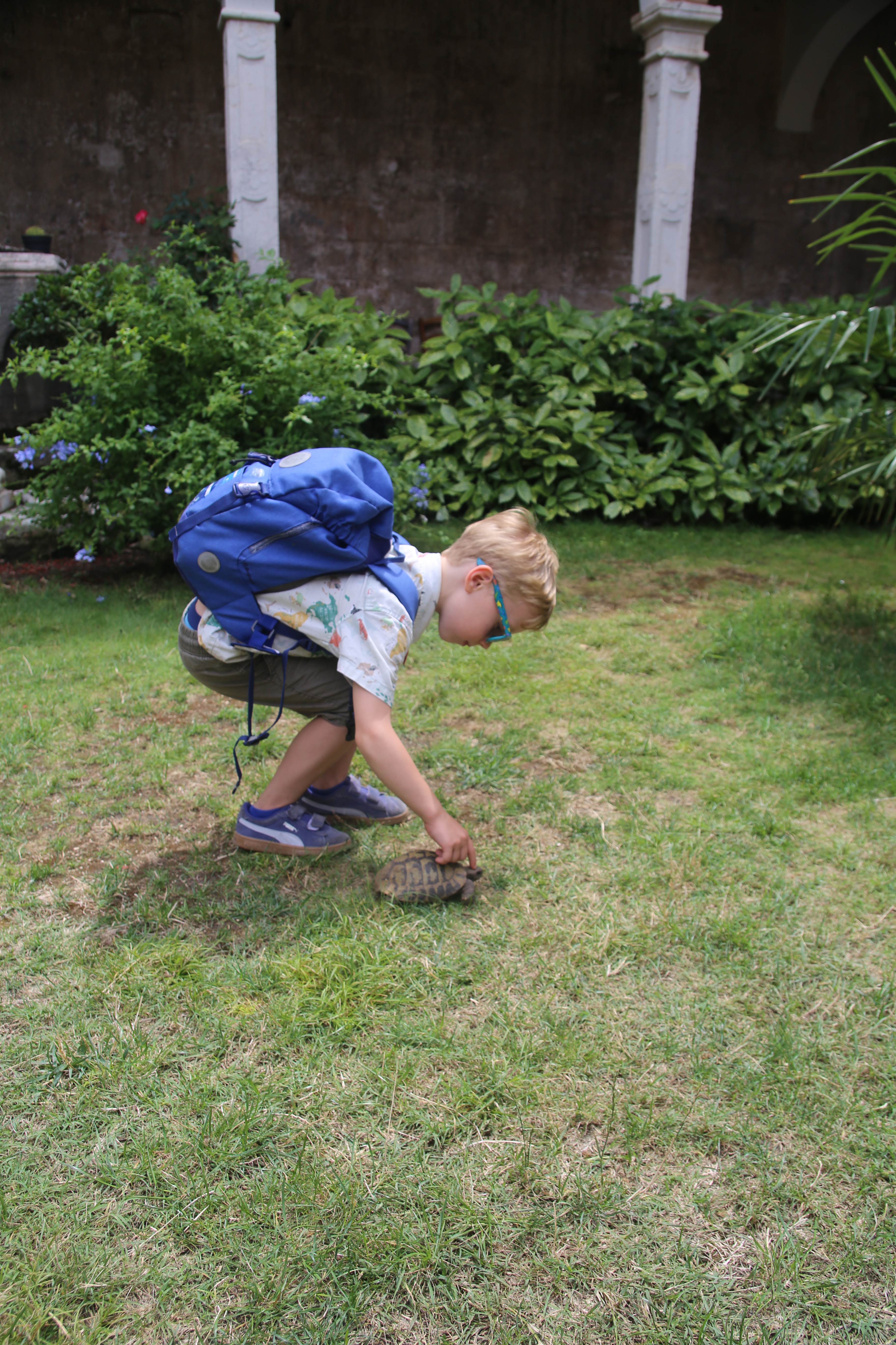 Warto było! Sam ogród jest uroczy, otoczony jest wczesnośredniowiecznym krużgankiem, a w samym krużganku znajduje się lapidarium średniowiecznych rzeźb. Mało tego, jedno z pomieszczeń przylegających do krużganka jest udostępnione do zwiedzania, a znajduje się w nim pochodząca z III wieku mozaika podłogowa przedstawiająca hippokampa (pół konia, pół rybę). Sam kościół, wzniesiony w XIV wieku, zadziwia surowością wnętrza. Jedynym zdobnym fragmentem jest ołtarz z XV wieku, ale niesamowity jest absolutny brak barokizacji. Nie przypominam sobie, żebym kiedyś widziała gotycki kościół, który przetrwał do dziś w tak mało zmienionej formie. Dodam jeszcze, że atrakcją dla dzieci są… żółtwie biegające po ogrodzie! Naliczyliśmy ich chyba 20, do tego stadko malutkich okazów, które wyglądały, jakby zupełnie niedawno się wykluły. Ogólnie rzecz biorąc, uważam, że to miejsce jest prawdziwą ukrytą perełką.
