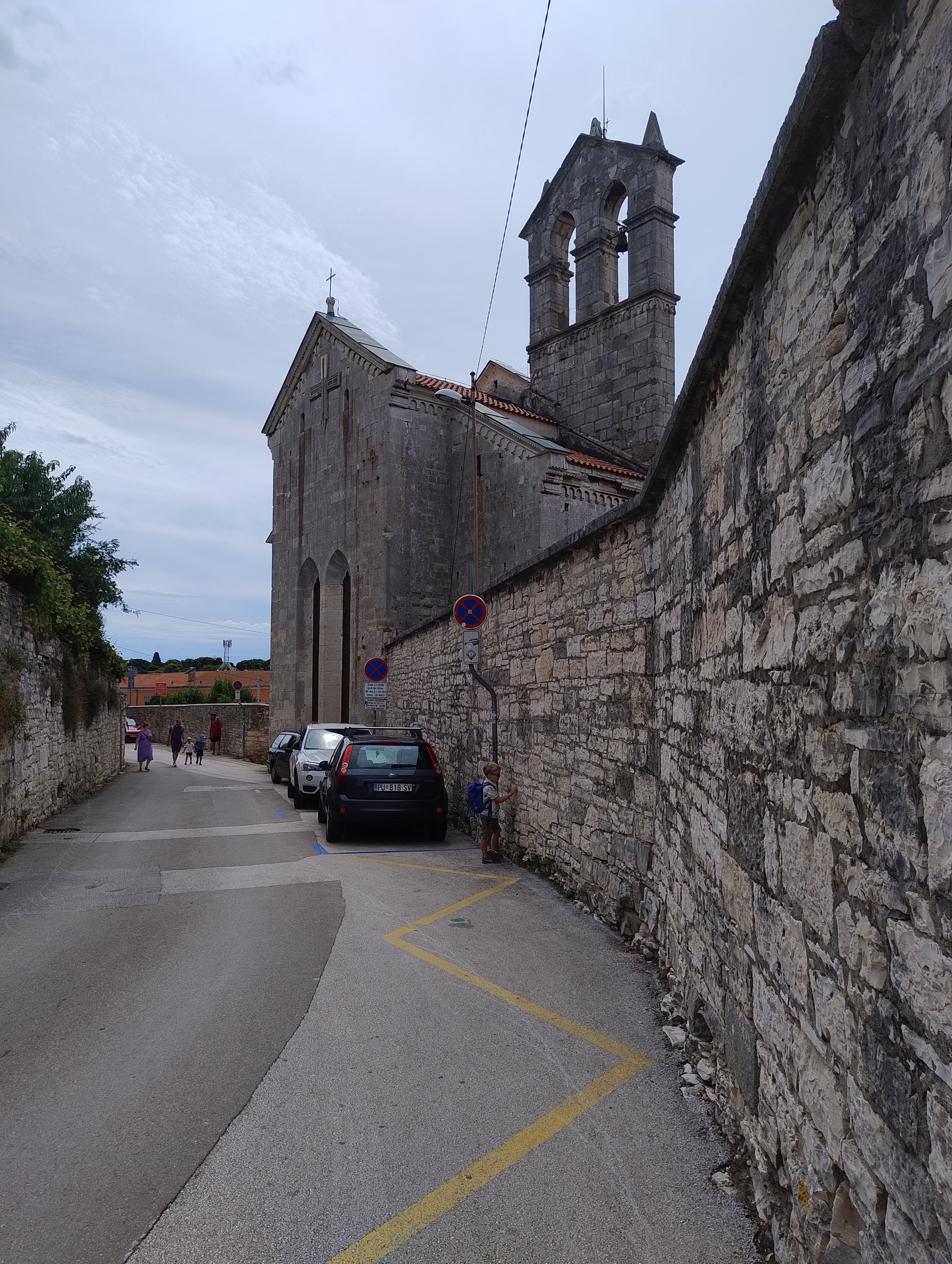 Na koniec wycieczki do Puli podzieliliśmy się na dwie grupy – Marcin i Zyzio poszli do Muzeum Sztuki Współczesnej, a ja i Stefek wdrapaliśmy się na wzgórze, na którym znajduje się fort. Ze względu na ograniczony czas zdecydowaliśmy, żeby nie wchodzić do środka, tylko obejść fortyfikacje z zewnątrz. Ze wzgórza jest doskonały widok na port, mały teatr rzymski, a nawet amfiteatr, więc zdecydowanie polecam spacer ścieżką dookoła. Po kilkunastu minutach musieliśmy już schodzić i kierować się w stronę amfiteatru, ale mój wzrok przykuła surowa bryła kościoła. Okazało się, że to kościół św. Franciszka, który położony jest na wzgórzu, a obok niego znajduje się jeszcze klasztor i ogród. Czas naprawdę naglił (Marcin i Zyzio już skończyli zwiedzanie Muzeum), ale wejście do ogrodu i kościoła kosztowało jedynie 1 euro, więc skusiliśmy się na wizytę.